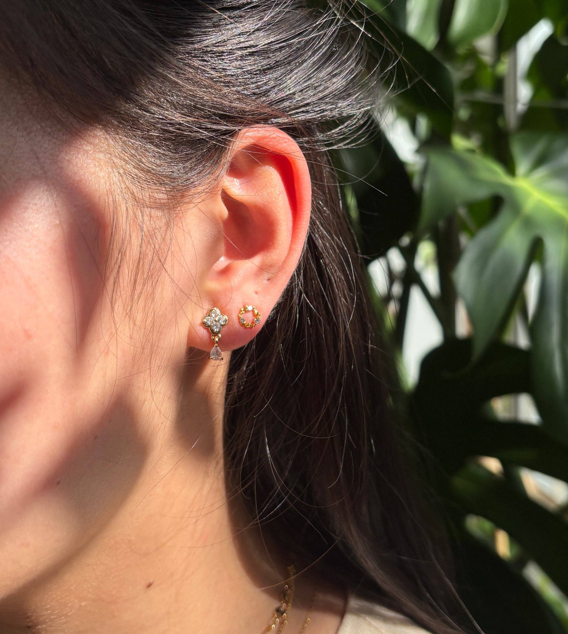 Delicate and feminine, these earrings feature a sparkling cubic zirconia flower that sits on the ear, paired with a dainty CZ drop for added shimmer. Elegant enough for special occasions yet subtle for everyday wear, they add a touch of charm to any look.