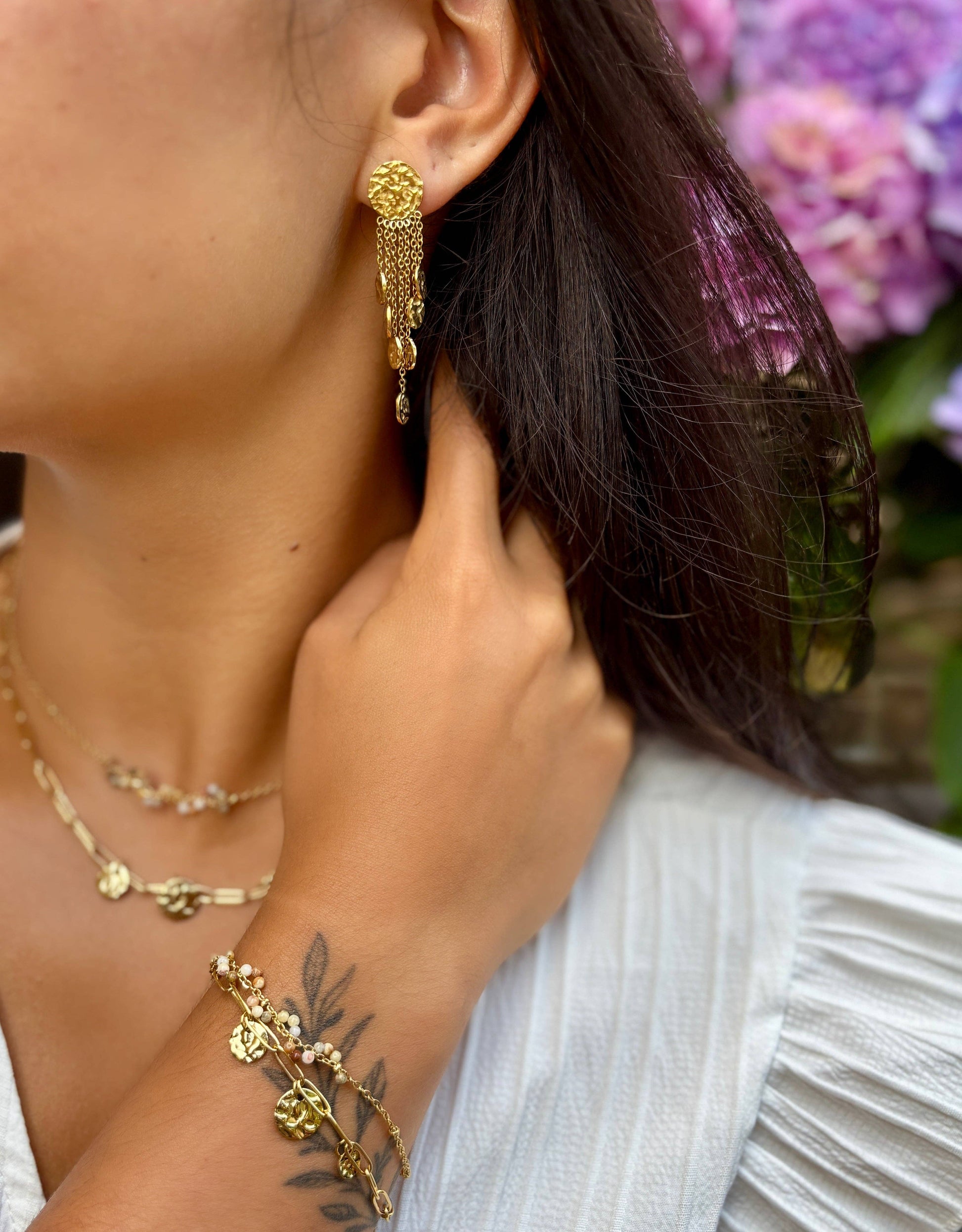 This delicate pair of 18ct gold plated hammered earrings features seven fine chains cascading from each disc, finished with smaller discs in gradually increasing sizes.