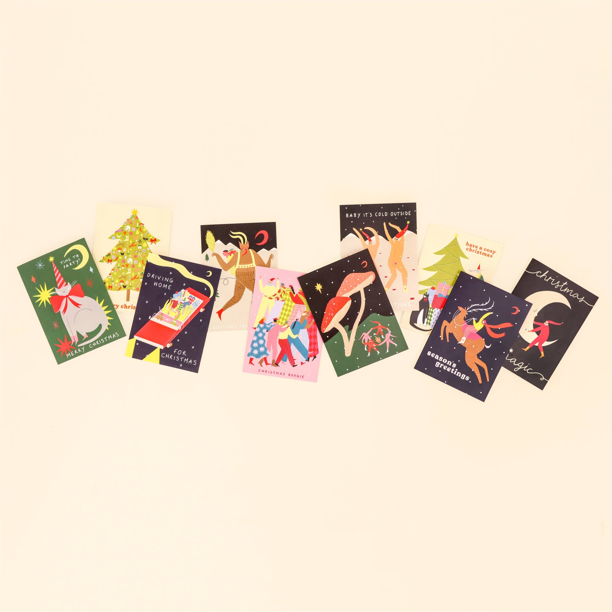 These greeting cards are illustrated by Sarah Wilson for Little Black Cat Illustrated Goods, a UK based brand. The designs showcase the brand's playful artwork style, which is can be seen throughout their collection of unique greeting cards and art prints.