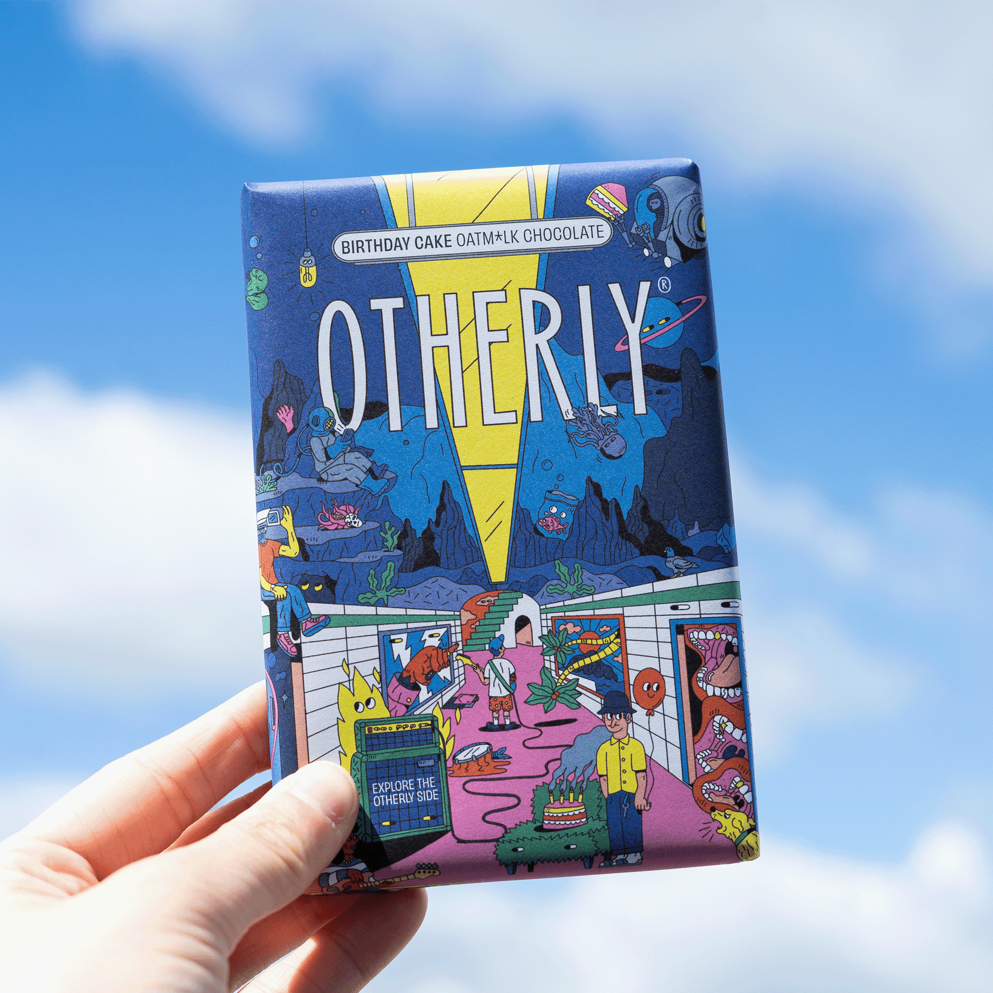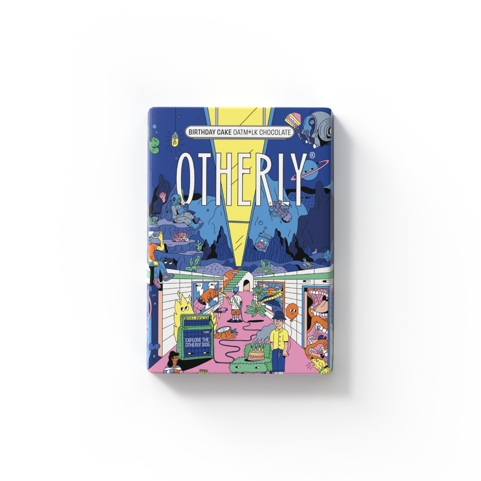 OTHERLY Birthday Cake Oatm*lk is a plant-based chocolate 43% cacao content made with fine flavour cocoa beans from Colombia and oat powder; Taking a bite, the chocolate yields with a satisfying snap, releasing a burst of flavors on your palate. The creamy, velvety texture of the oatm*lk chocolate envelops your taste buds, providing a luxurious mouthfeel that complements the sweetness perfectly. Within this harmonious blend, you encounter crunchy bits that add a delightful contrast to the smoothness. These are the cake-like components, woven into the chocolate, imitating the tender crumb of a birthday cake. Each nibble brings forth playful sensations, as a sensory celebration, delighting both the taste buds and the heart.