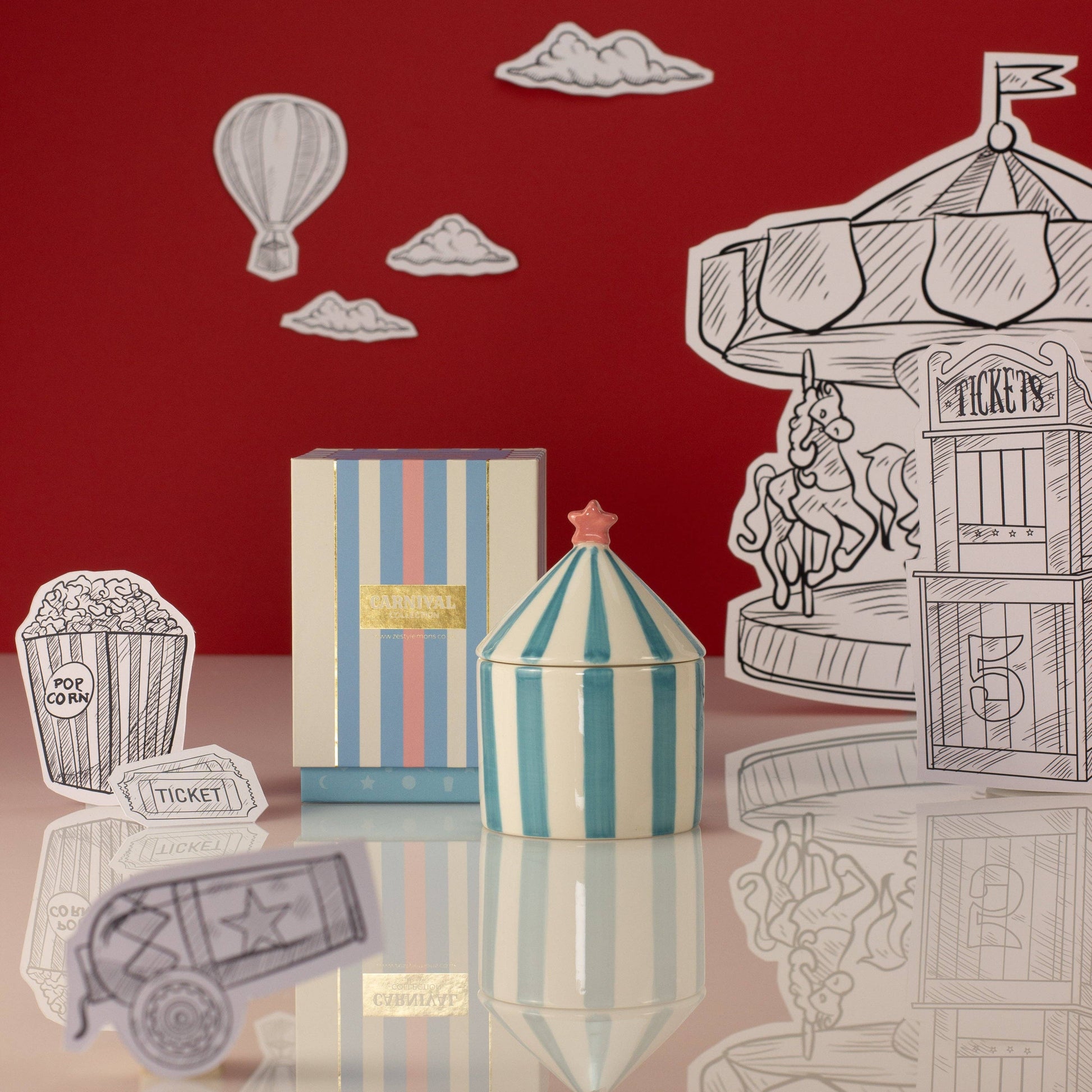 Housed in a striped ceramic vessel inspired by a classic circus tent, this candle with a lid brings playful charm with clean blue stripes that elevate any space.