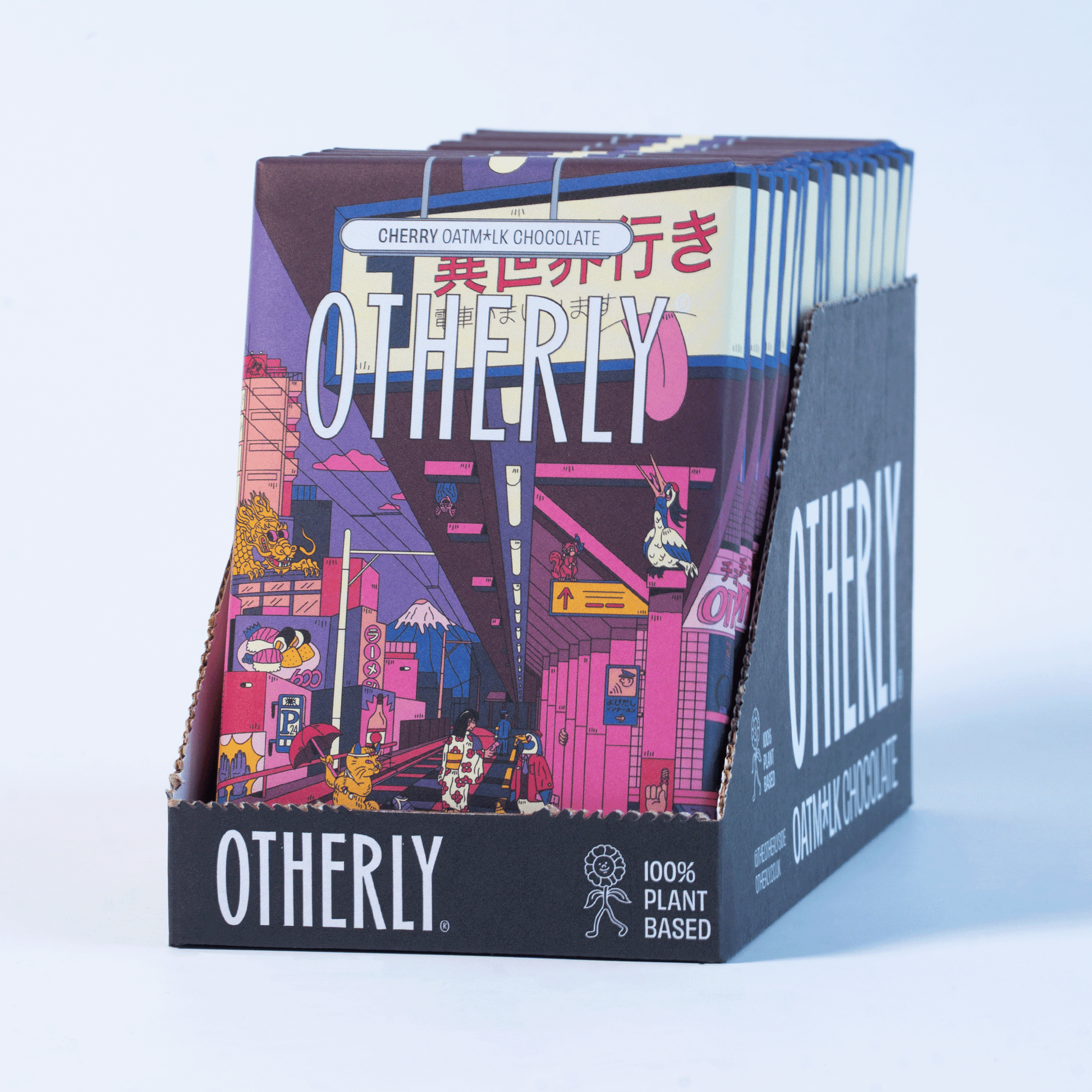 OTHERLY Cherry Oatm*lk is the perfect plant-based chocolate 43% cacao content with a unique balance of experiences, blending the richness of cocoa, the creaminess of oatm*lk, and the bright burst of candied cherry into a symphony of flavors and textures that will leave you enchanted and craving for more, as the sweet cherry gradually softens, leaving a subtle aftertaste that lingers pleasantly, inviting you to take another bite.