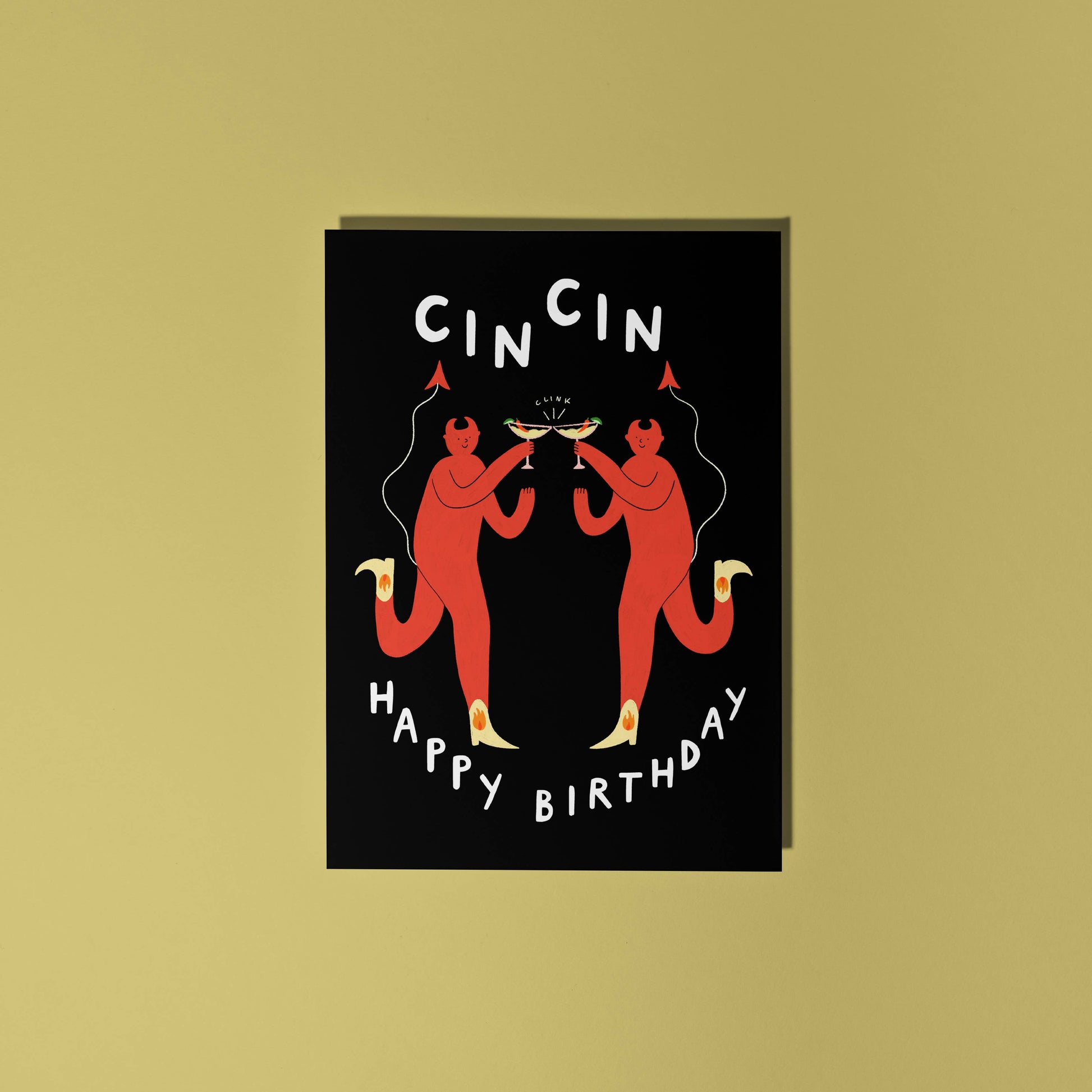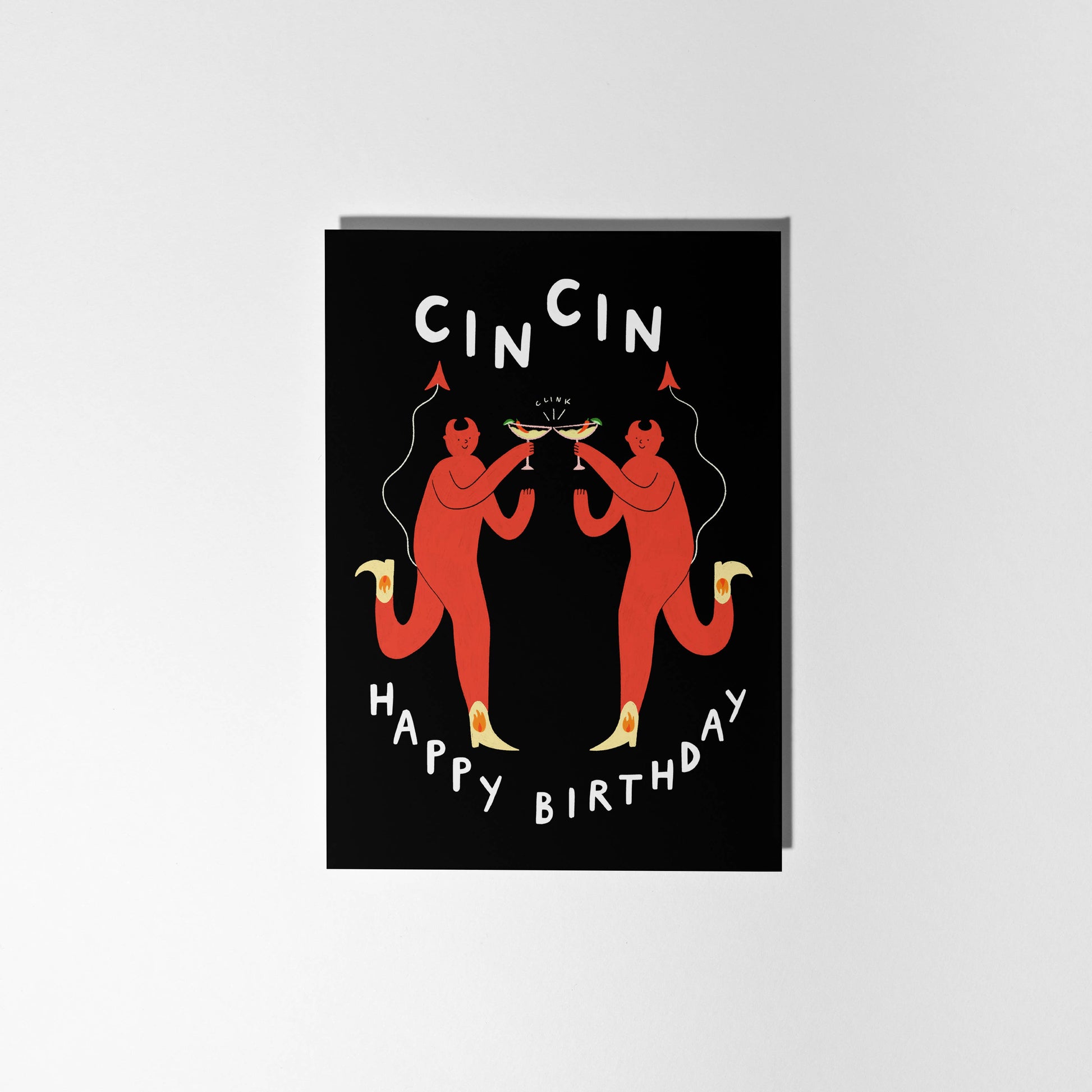 Contemporary cocktail card featuring two cheeky devils toasting spicy margaritas. Playful type reads 'Cin Cin Happy Birthday'.