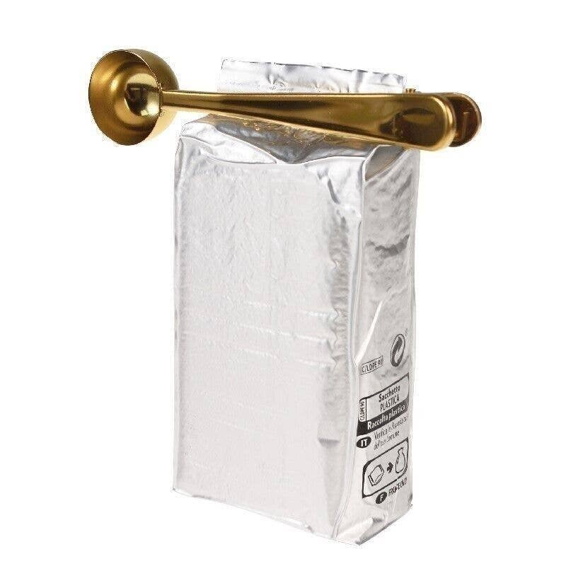 Gold-coloured stainless steel coffee scoop with a 2 in 1 design.