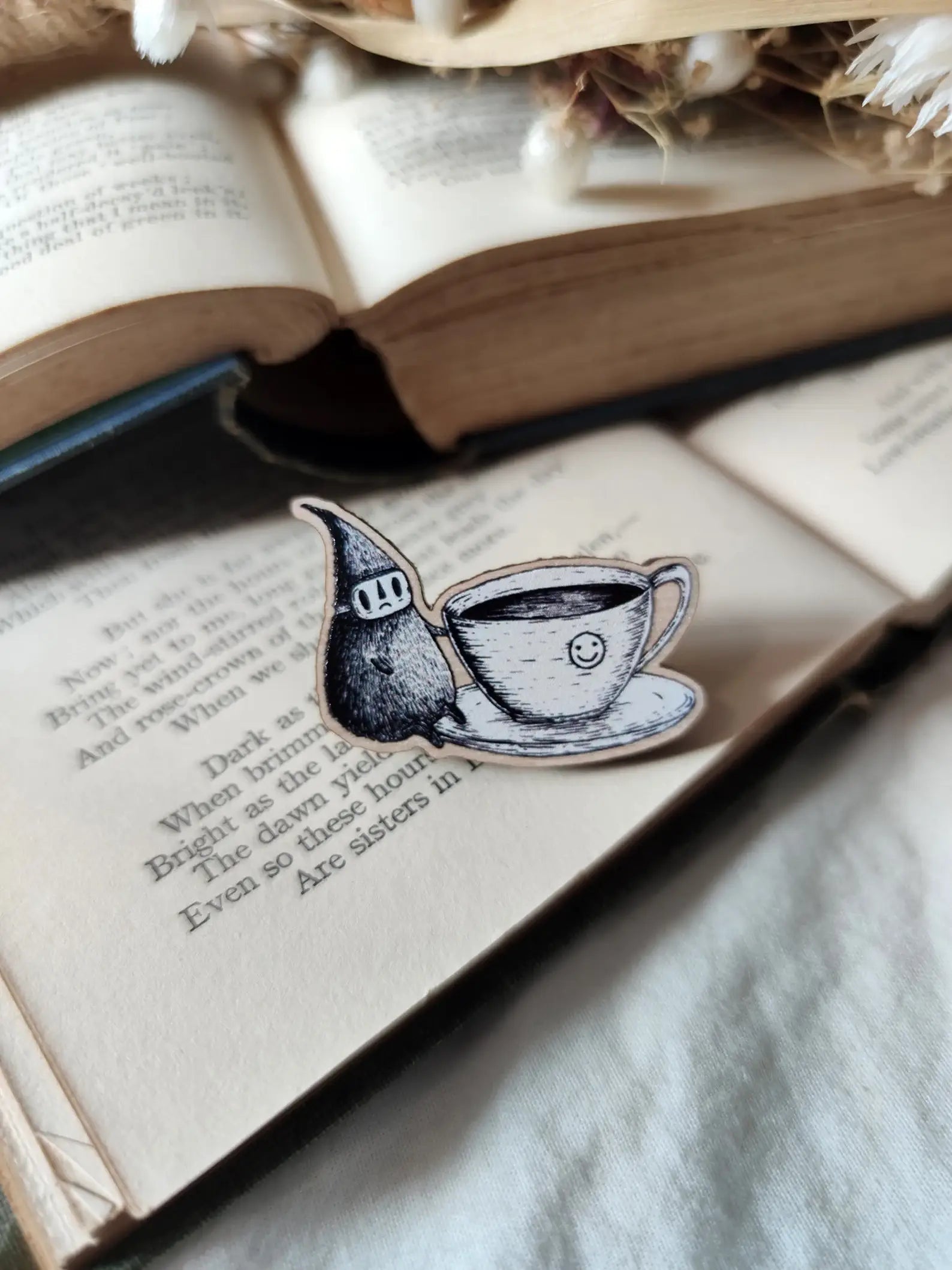 Don't talk to him til he's had his coffee! An anxious little masked spirit perched on a coffee cup, on a lovely sturdy wooden pin; the design, from an original ink drawing by Jon Turner, is printed onto sustainably sourced textured maple wood, and then lasercut, with a pin back and rubber clutch to the reverse. Approximately 5cm (2 inches) across. Presented on a backing card.
