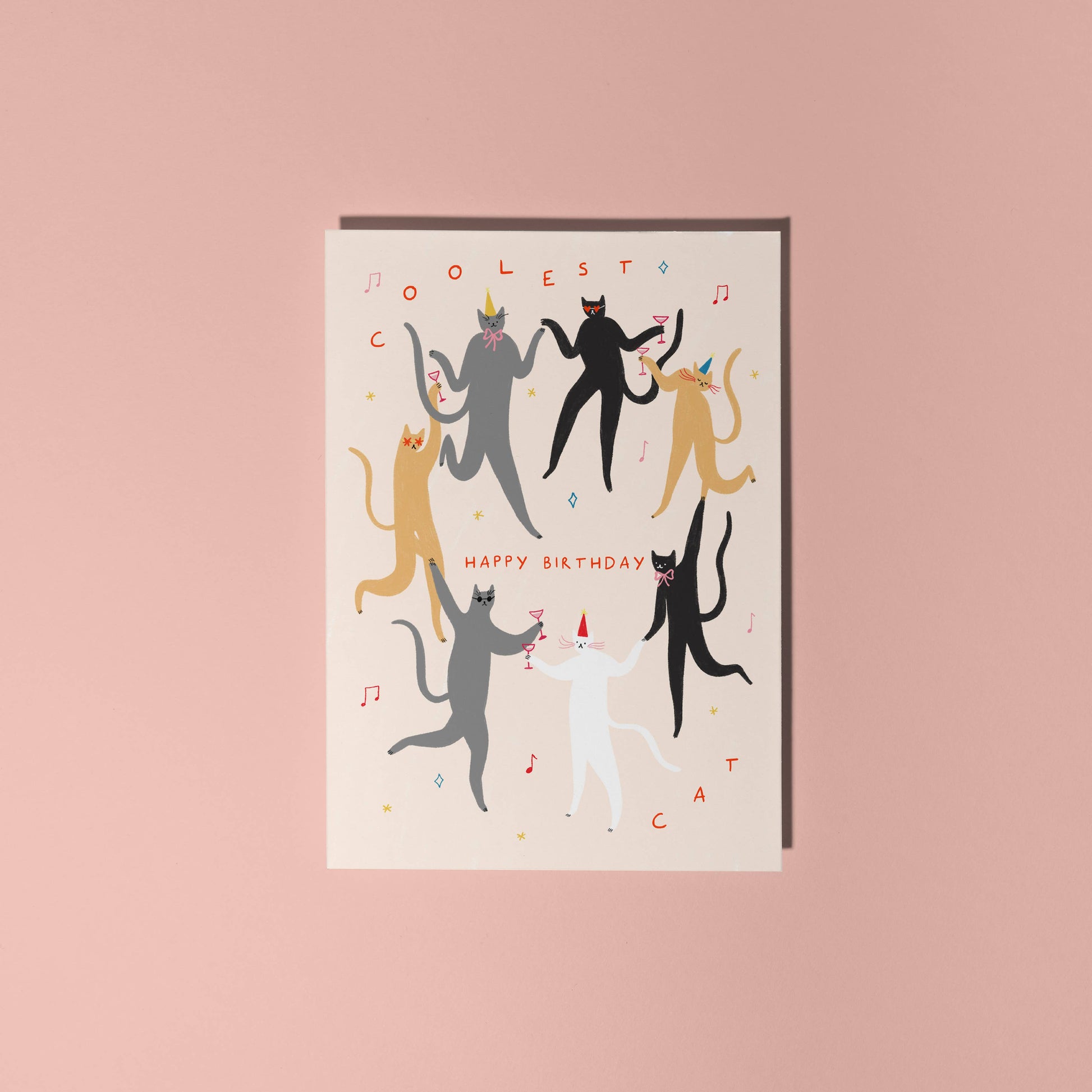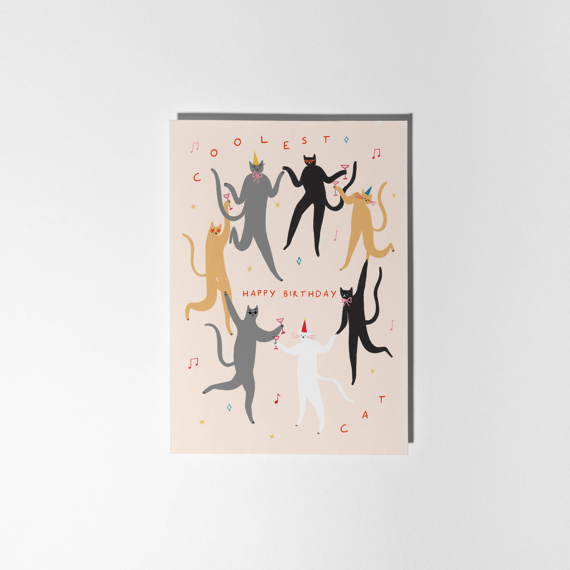 Illustrated card featuring a circle of dancing cats partying wearing hats, sunglasses and drinking. Text reads 'Happy Birthday, Coolest Cat'.