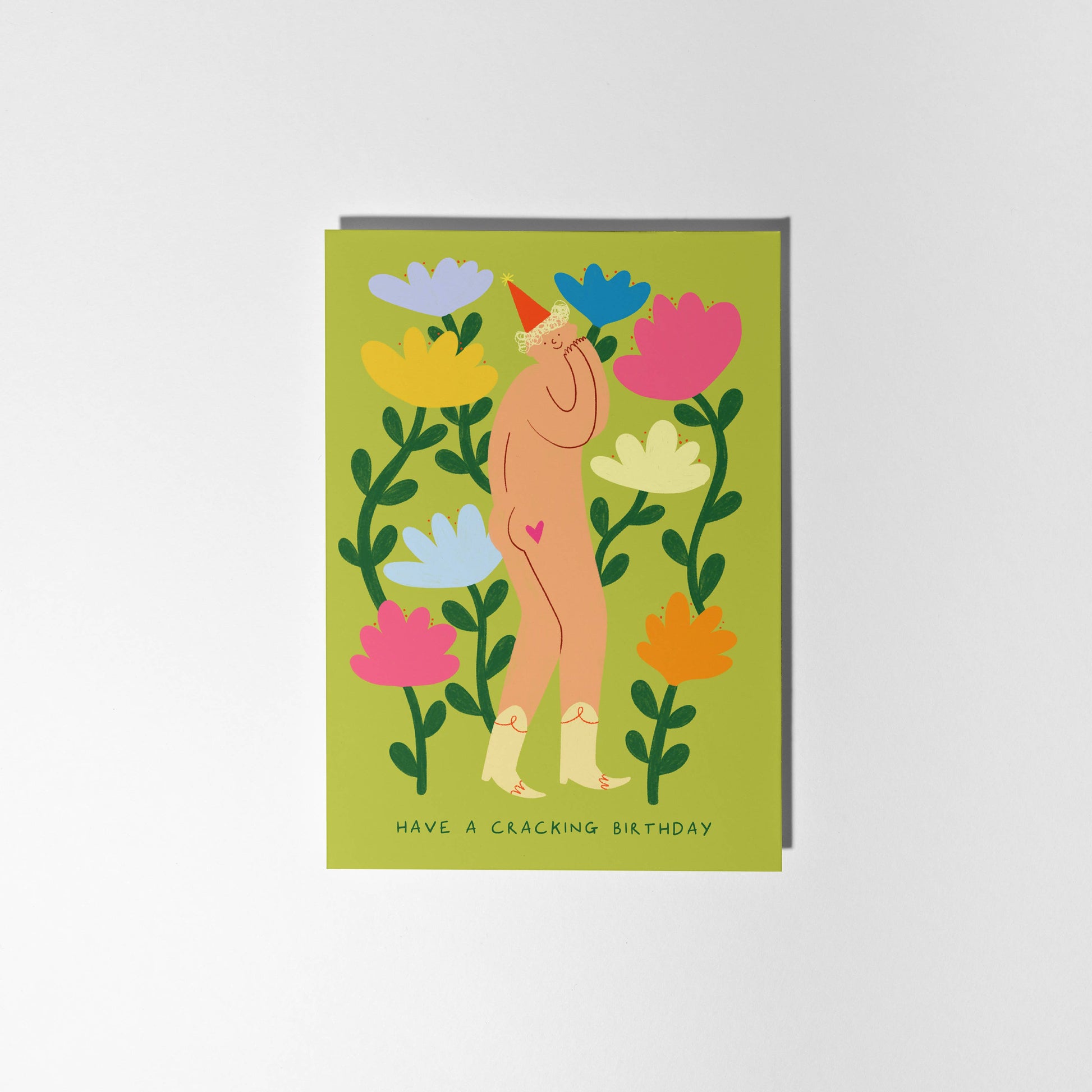 Silly birthday card featuring illustration of a cheeky figure wearing cowboy boots, a party hat and not much else! Surrounded by colourful flowers. Text reads 'Have a Cracking Birthday'.