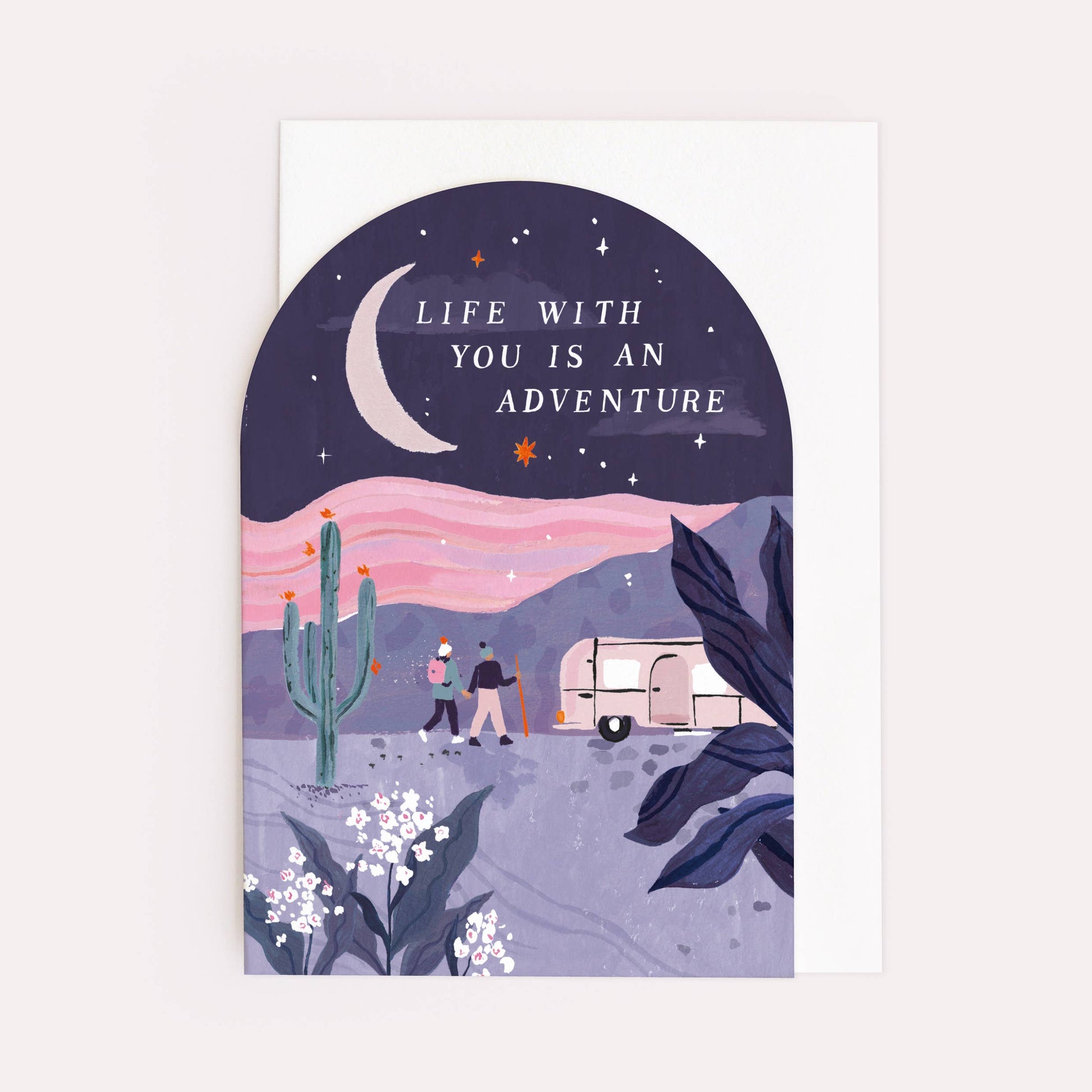 Anniversary card featuring a hand-painted illustration of a couple hiking with their Airstream camper van, capturing the essence of love and adventure in a beautiful outdoor setting. A heartfelt greeting card for adventurous couples, travel lovers, and hiking enthusiasts. Anniversary Card Unique arch shape Luxury white envelope Blank inside Luxury, 350gsm card from sustainable forests Illustrated by hand in London Made in the U.K. 100% Recyclable Card Size (WxH): 105 x 150mm / 4 x 6in