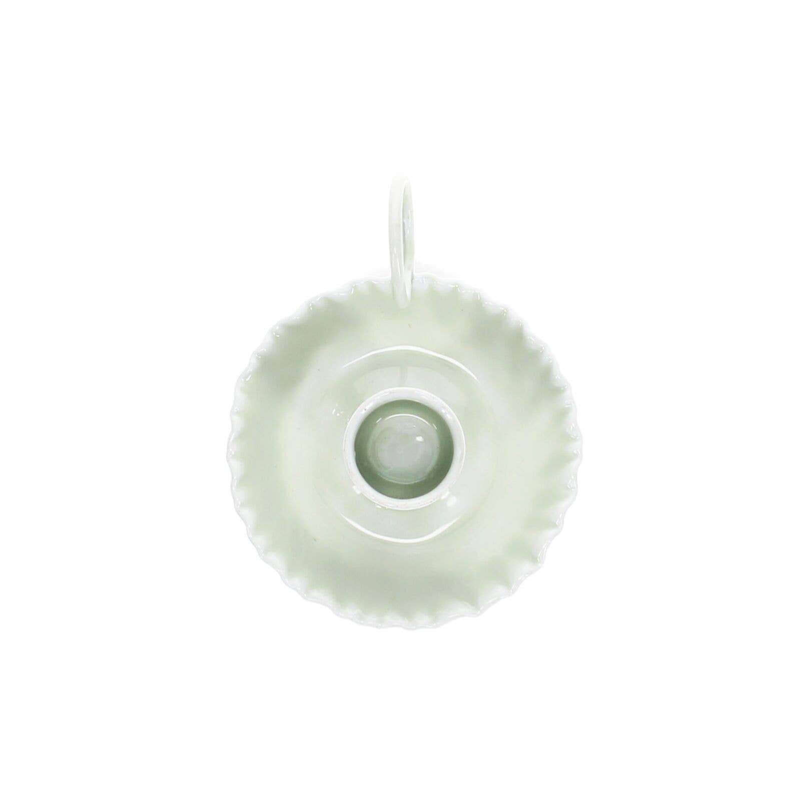 Cast metal candle holder with light grey enamel finish, made to resemble a chamberstick with its attached handle and small pan to catch dripping wax. Its simple design and striking colour gives a modern twist to a classical item, and will look great on any dining table or bedside table.