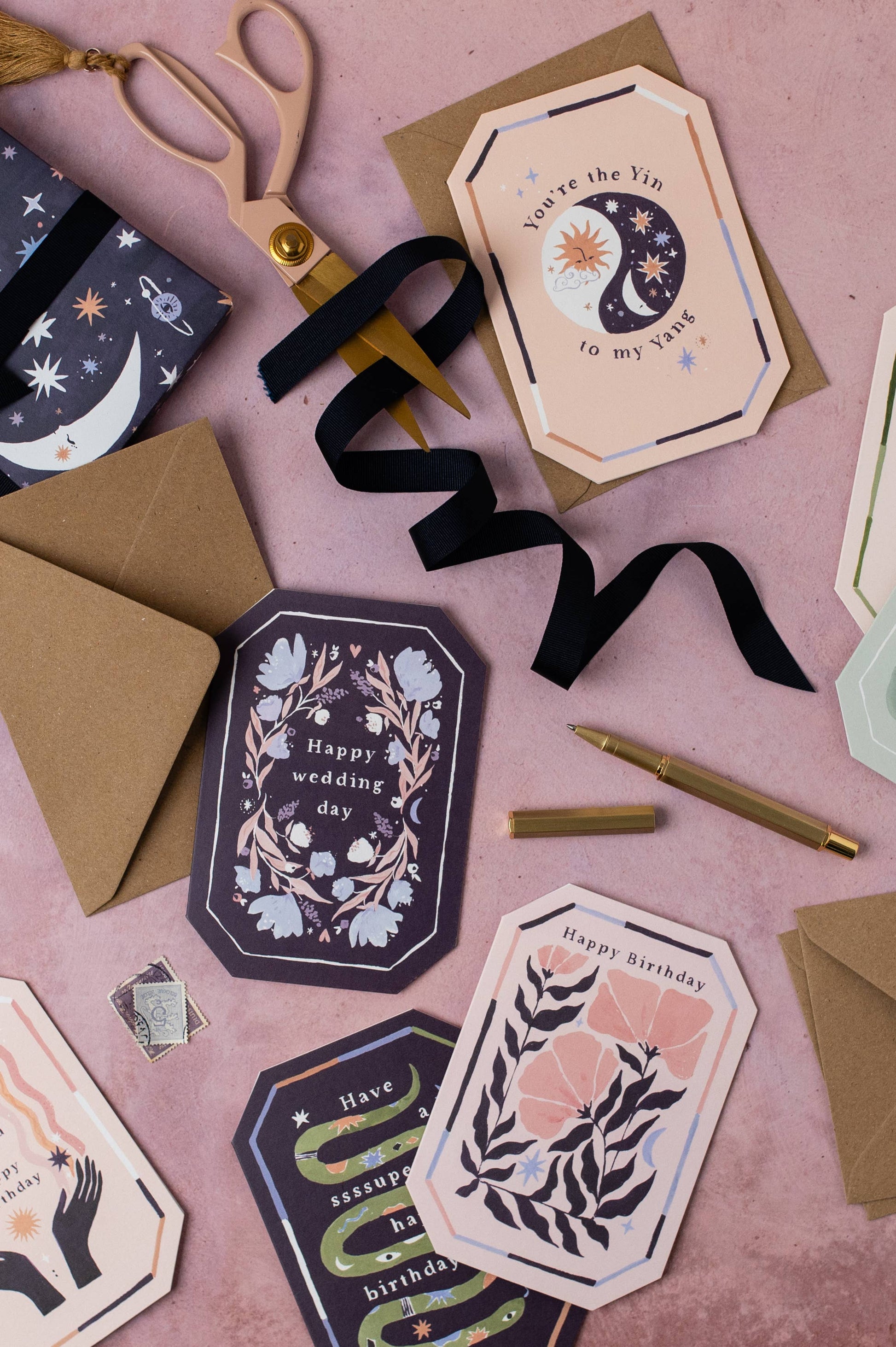 This wedding card is part of the unique collection of greetings cards from UK based brand Sister Paper Co. The cards stand out for their eye catching gem-shaped die cut design and hand-painted artwork for modern gifting occasions. This beautiful, luxury wedding card can be sent as a: