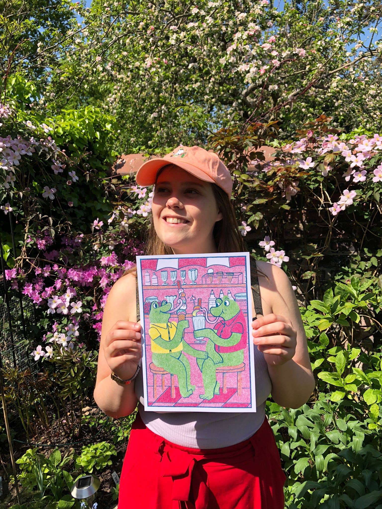 Part of a collection of two cute frogs going on lovely holidays together, this A4 print shows them having a grand old time at an ice cream parlour! Drawn digitally, these fun textures are reminiscent of riso prints, but in a digital format. Follow these frogs' adventures as they eat tasty food and have a fun time together :)