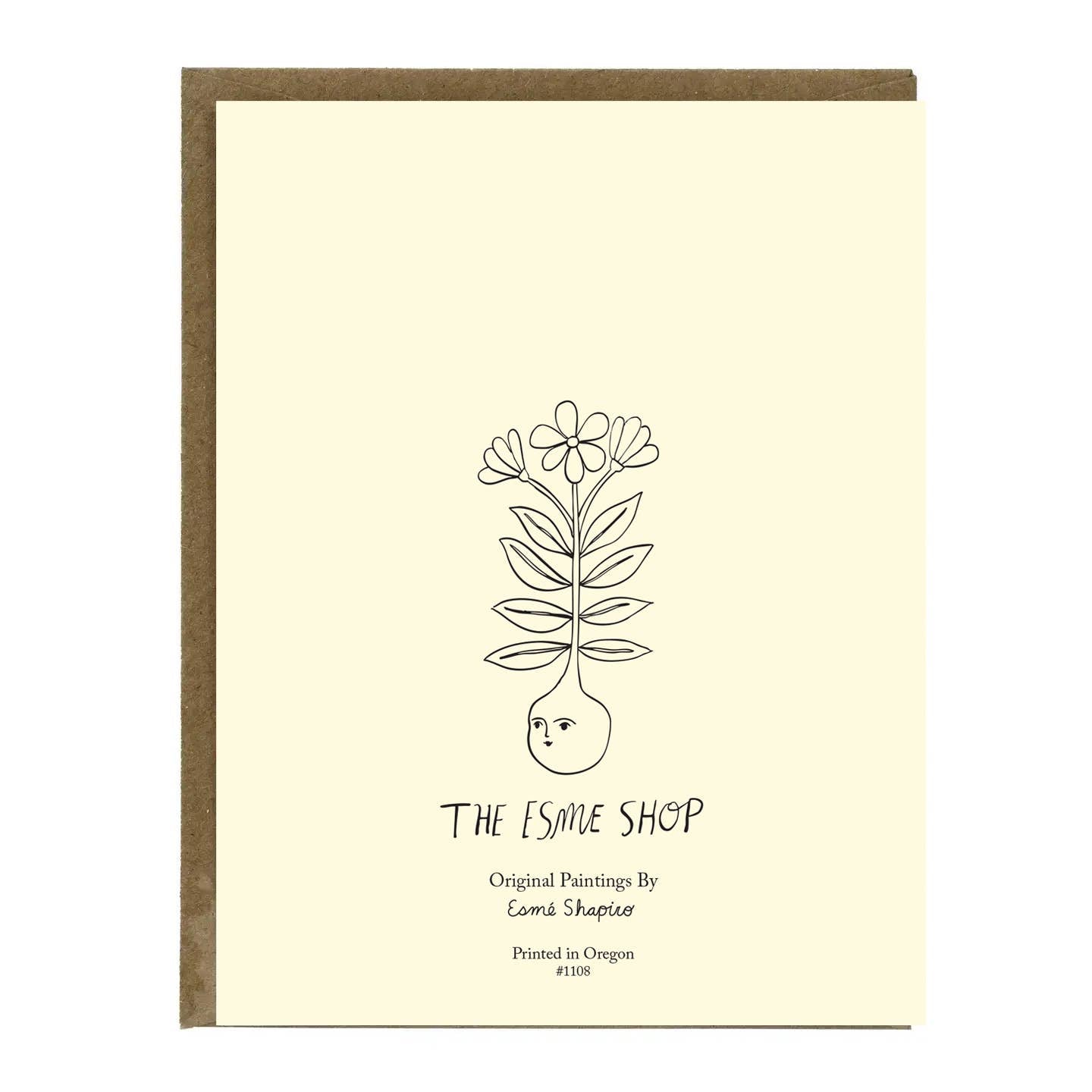 • 4.25" x 5.5” sleeved A2 card, blank inside and paired with a Kraft envelope. • Printed responsibly in the United States on 100# vellum with post-consumer recycled paper. • Illustrated by beloved Children’s book illustrator Esmé Shapiro.