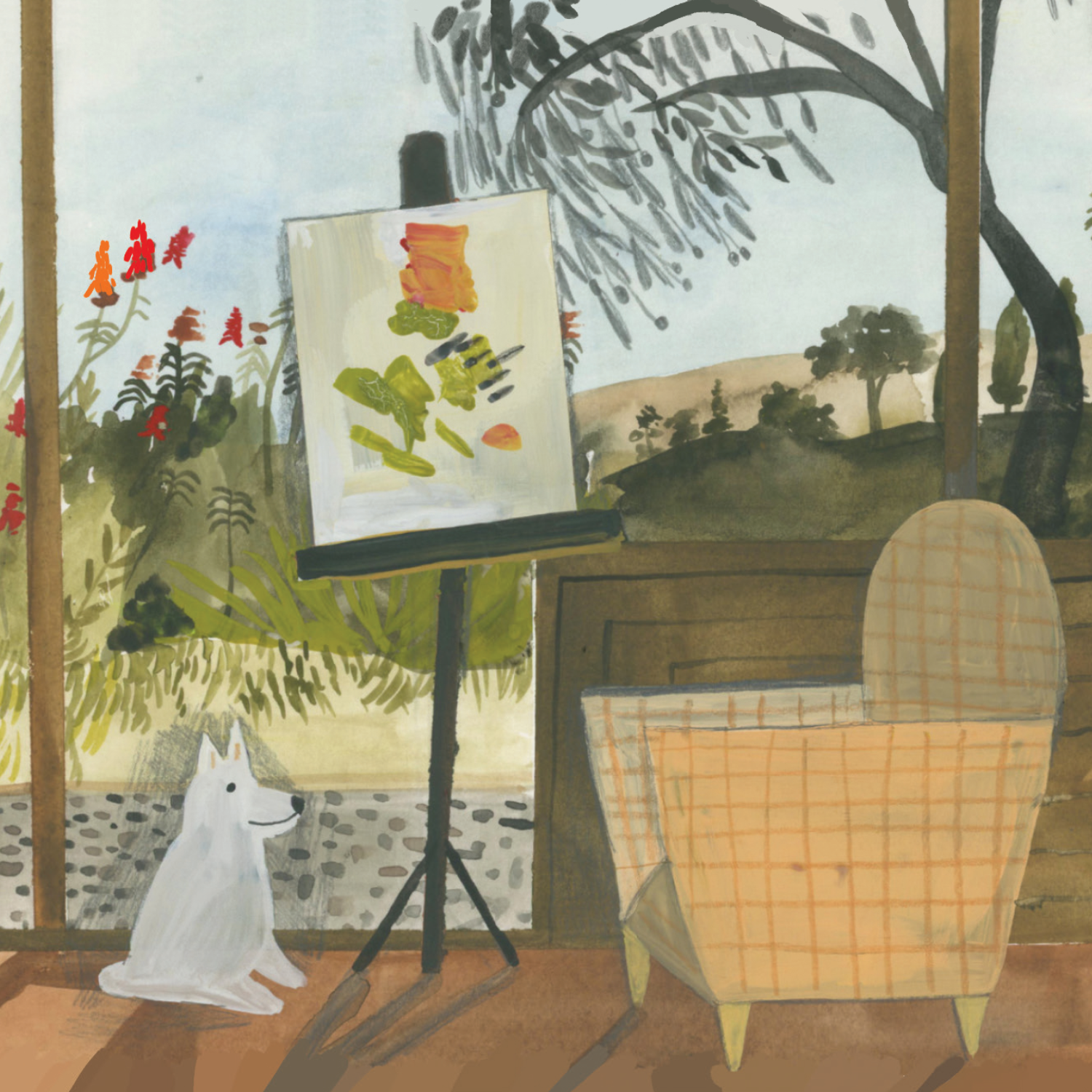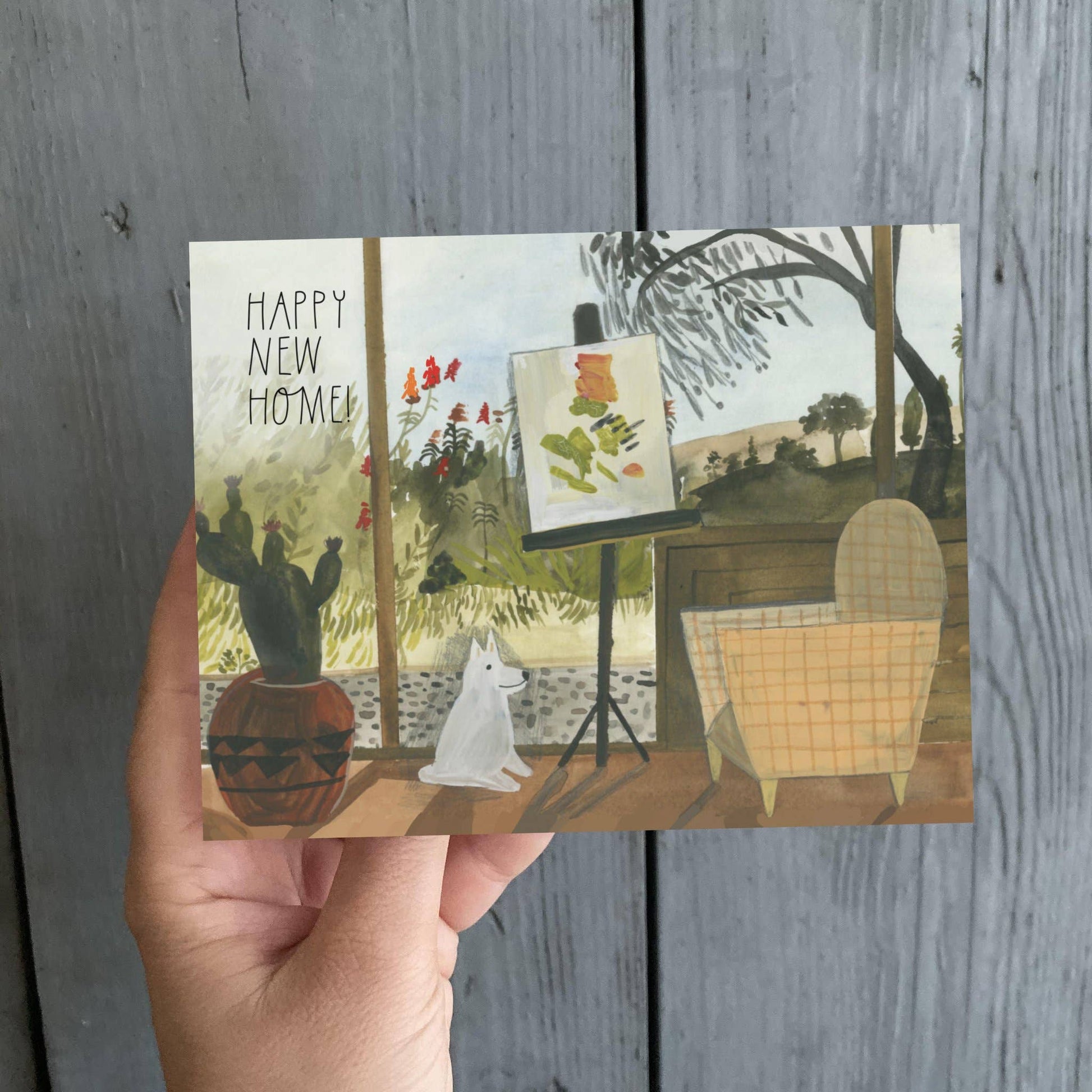 A delightful multicolored greeting card featuring a scene of a chair, an easel, a cactus, and a dog in the foreground with a background of trees in a yard, text reads "Happy New Home!"