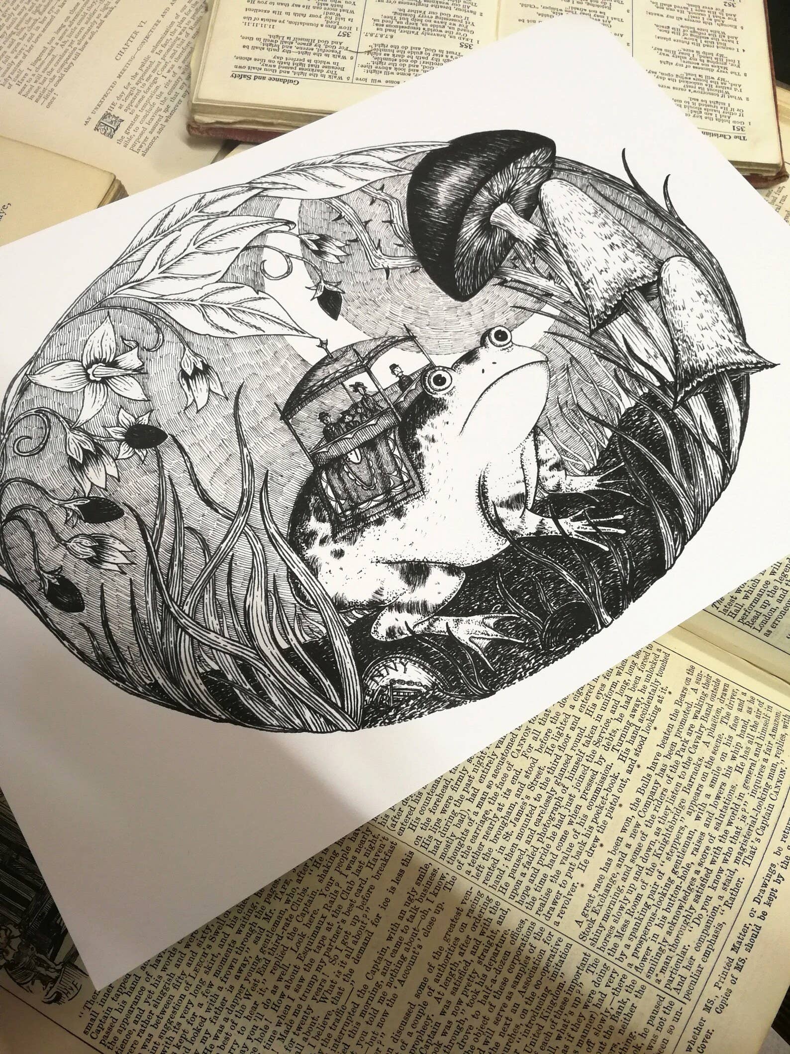 Digitally printed from an original pen and ink drawing, on smooth heavy silk 350gsm paper; black ink on a white background, available in 8x10 inch, A4 (21x29.7cm), or A3 (29.7x42cm) size. Signed, and packaged with a recycled backing board and packed in biodegradable eco-cello.