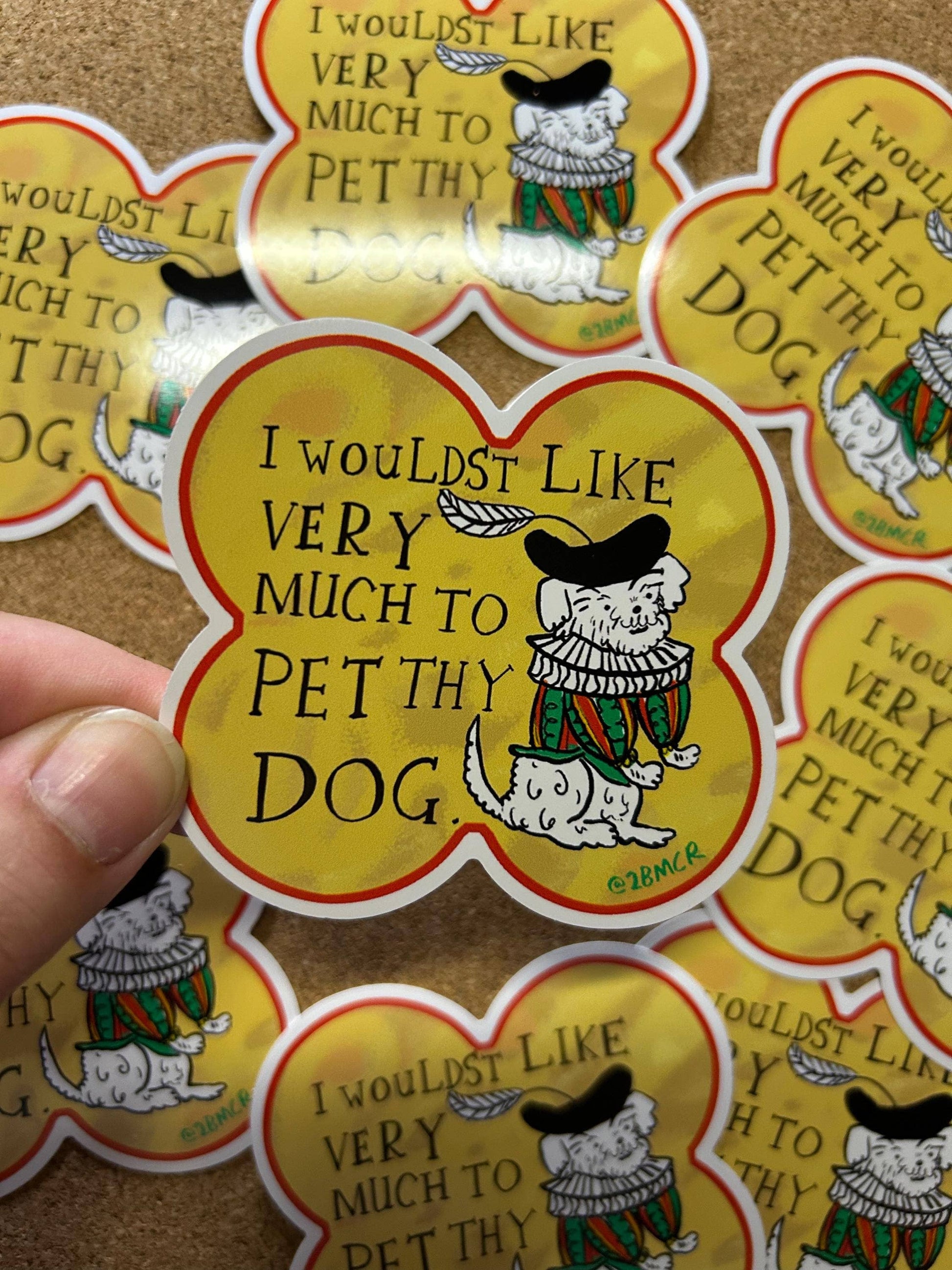 Please sir? May I? A cute sticker which reads "I Wouldst Like Very Much To Pet Thy Dog"