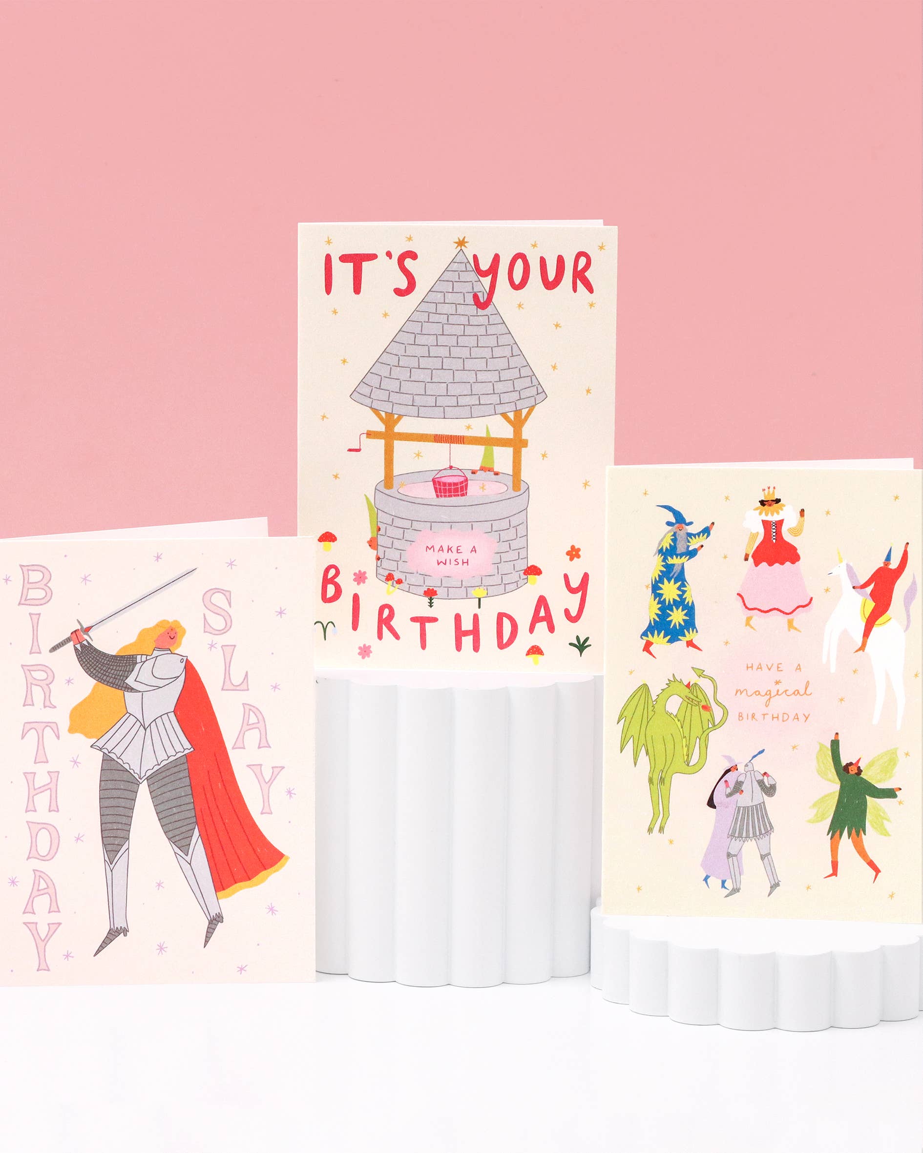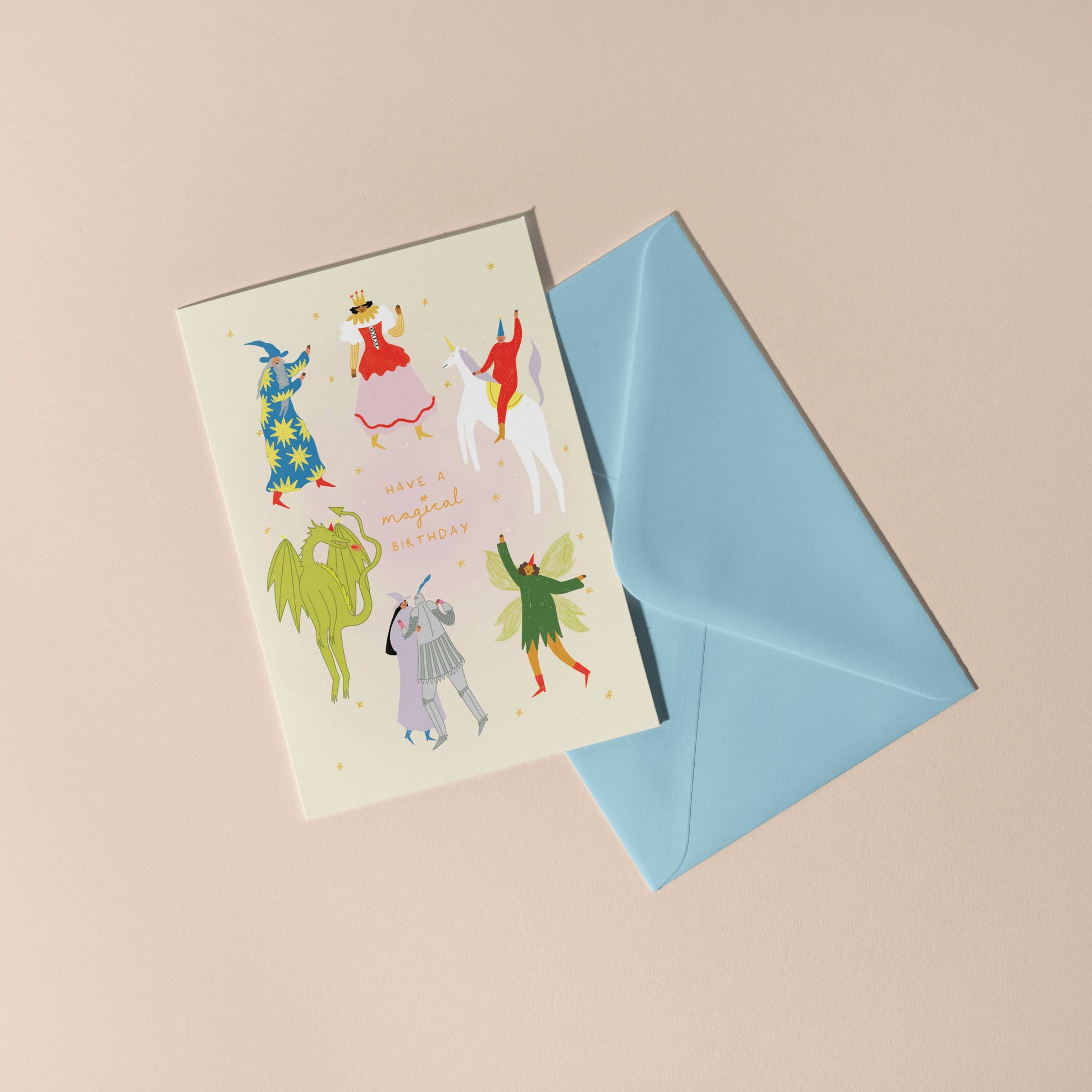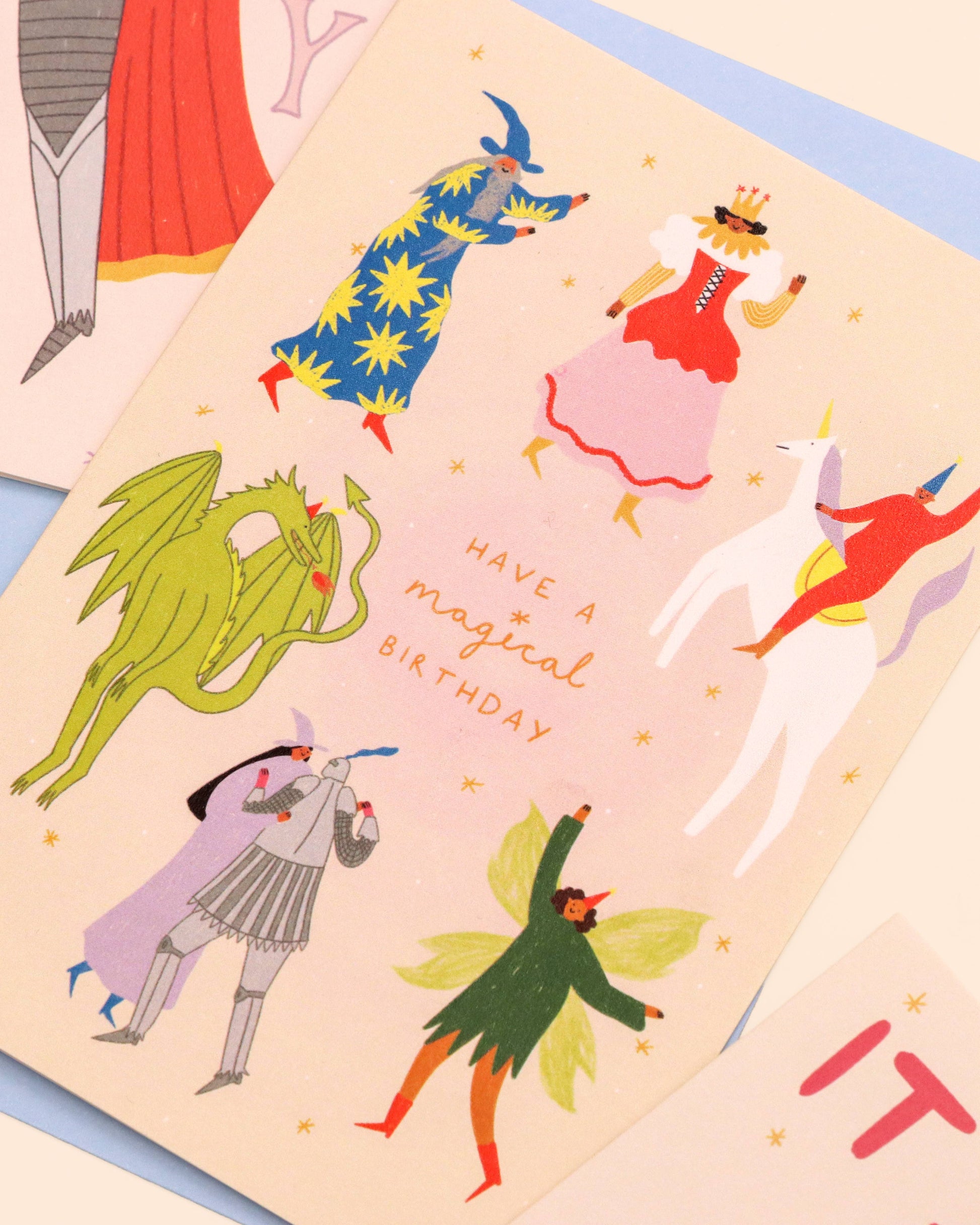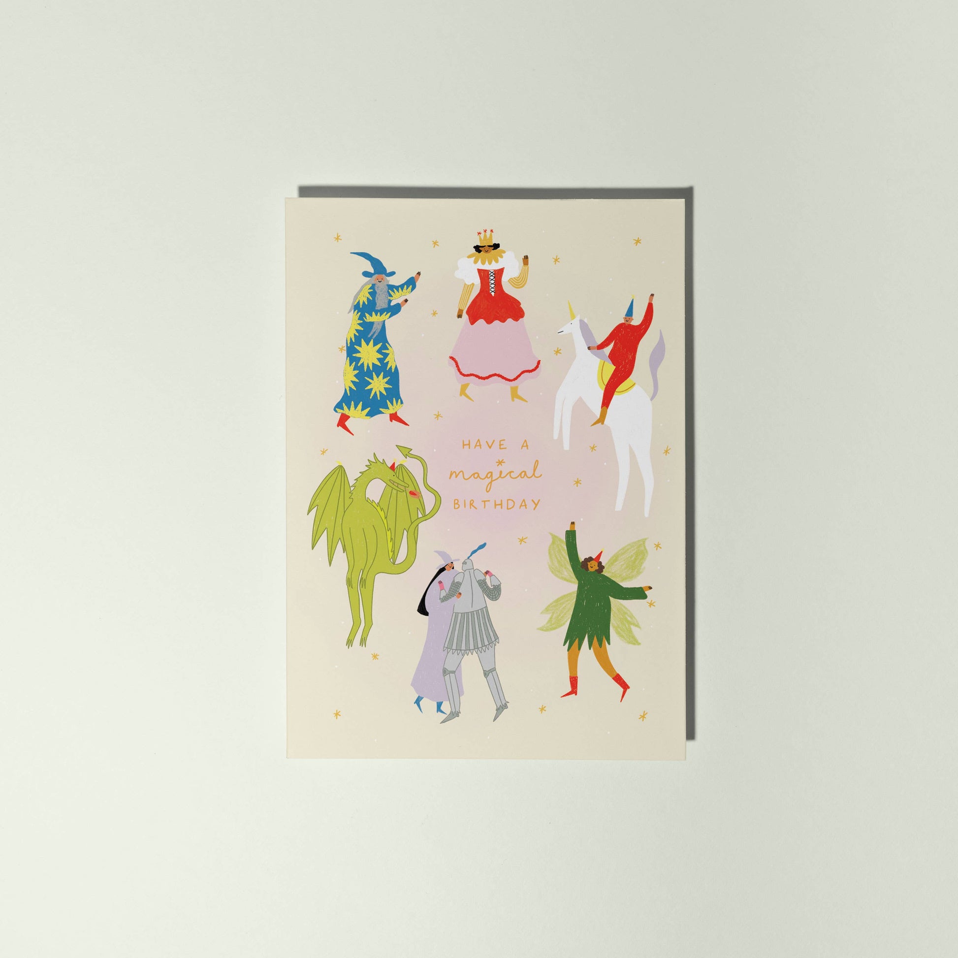 A fun birthday card featuring an array of folksy, fantasy characters having a dance party including a dragon, wizard, knight, unicorn and fairy. Perfect for kids, and also bookish fantasy loving adults.