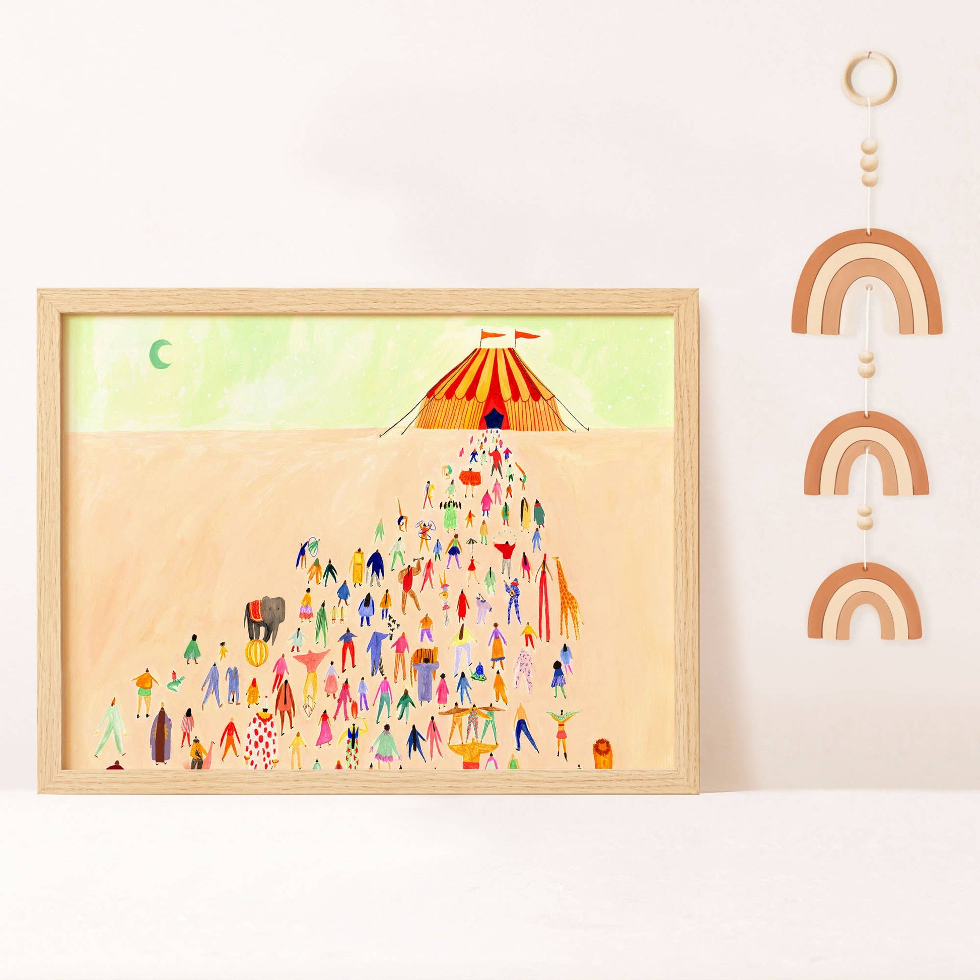 The circus is in town and absolutely everyone is excited to see the show, forming a crowd outside the illustrated big top on this giclée art print. Perfect for a nursery or living space.