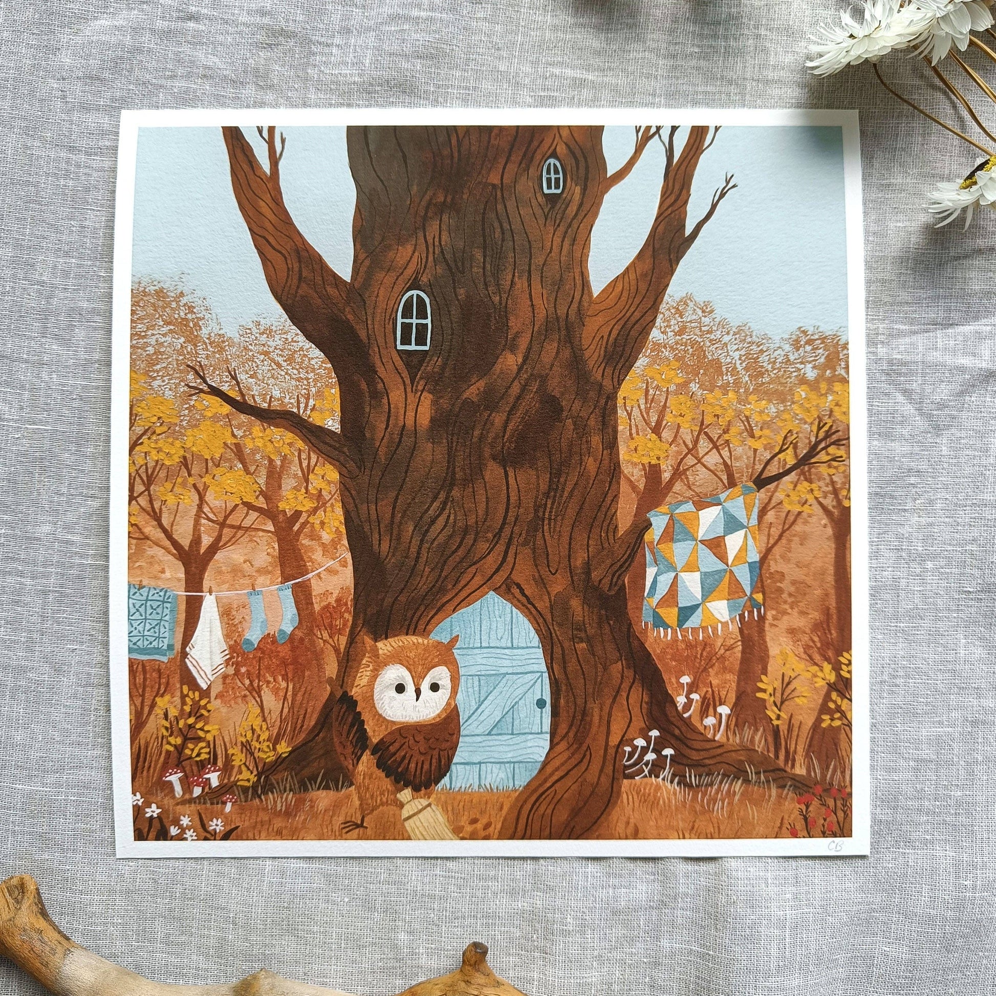 High quality giclee print of my original gouache painting "Cleaning owl"