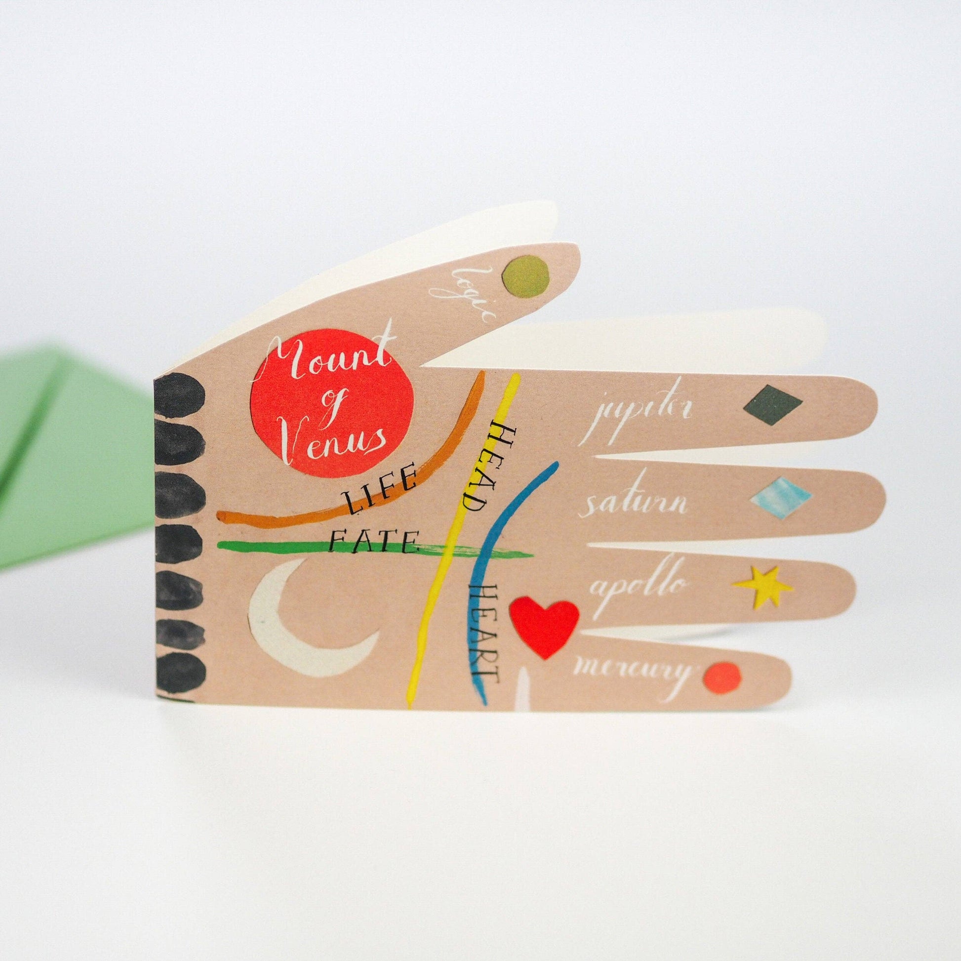 The Palm Reading card! A fun and colourful hand-shaped design, depicting the palm reading essentials. The perfect card for the curious, the dreamer, the fortune seeker and mystery lover in your life!