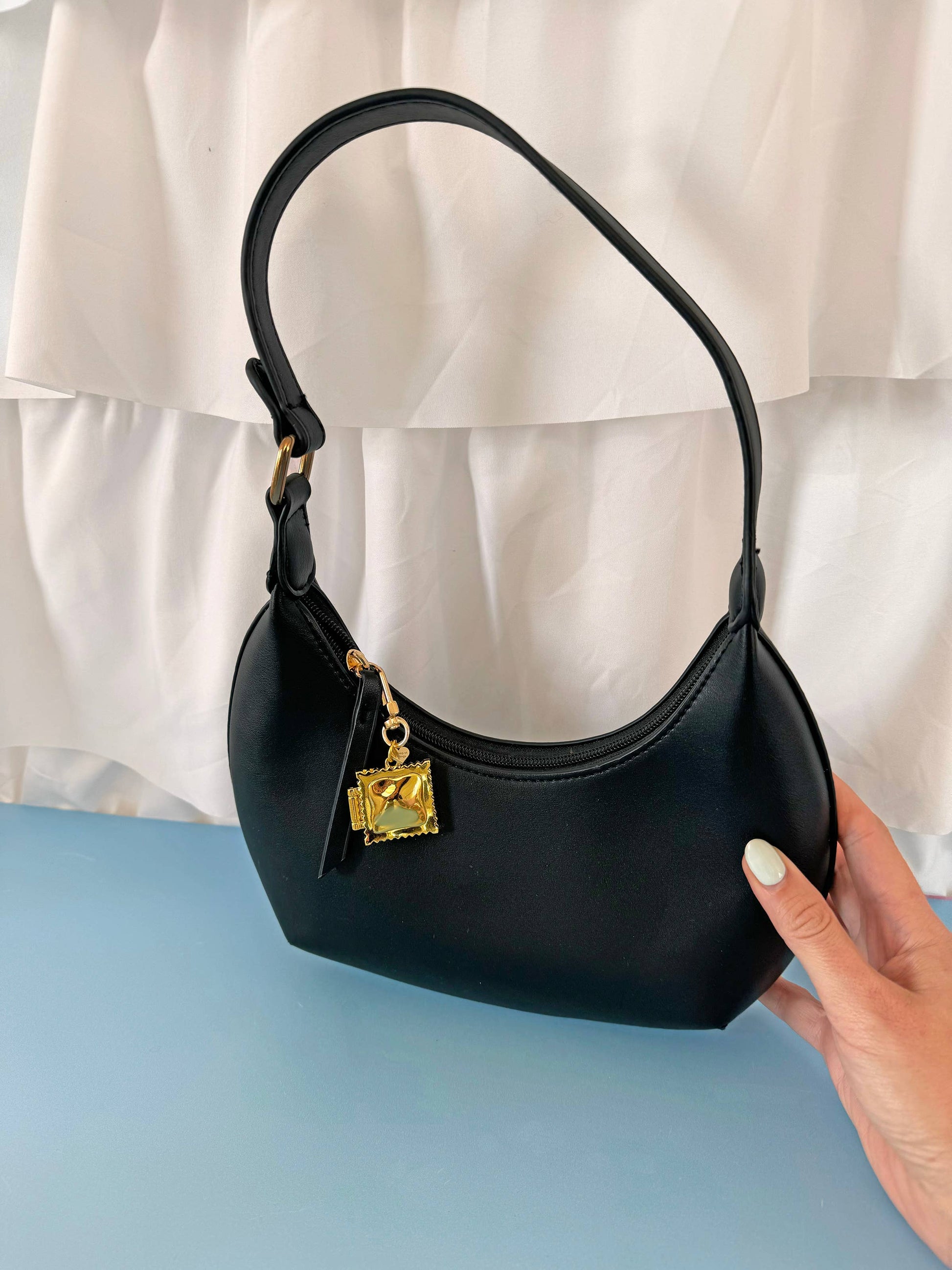 Ravioli locket keychain. Why not? Made of gold plated zinc alloy, this ravioli has a hinge so you can keep something special inside. We recommend a square of cheese to snack on later. A gorgeous, plump ravioli hangs off of a J clasp so you can add it to your keys without ruining your mani. Ravioli measures 1.25" and the locket is held tightly together by magnets. Comes with protective film on the outside, you can remove that before wearing unless you like the look.