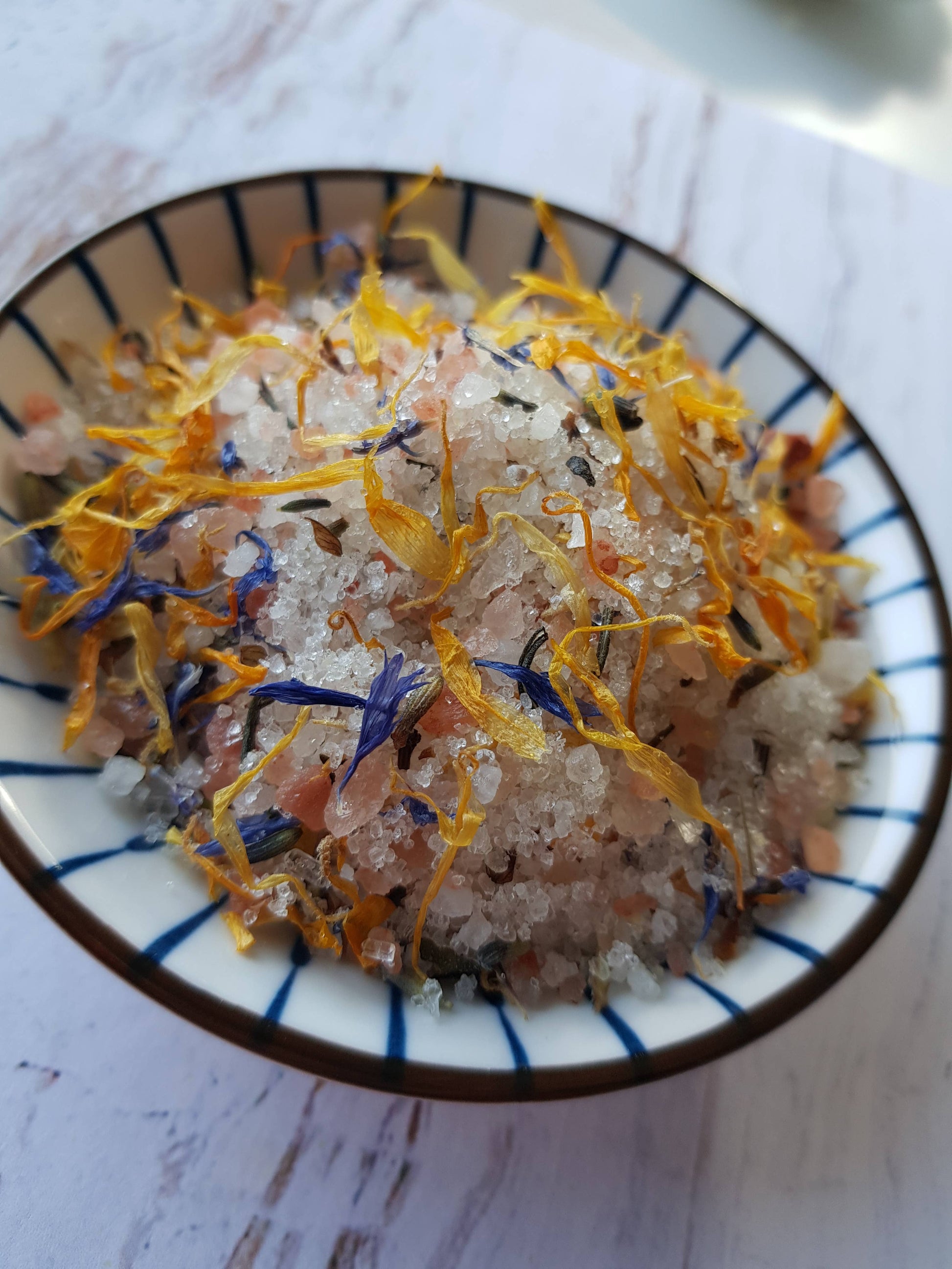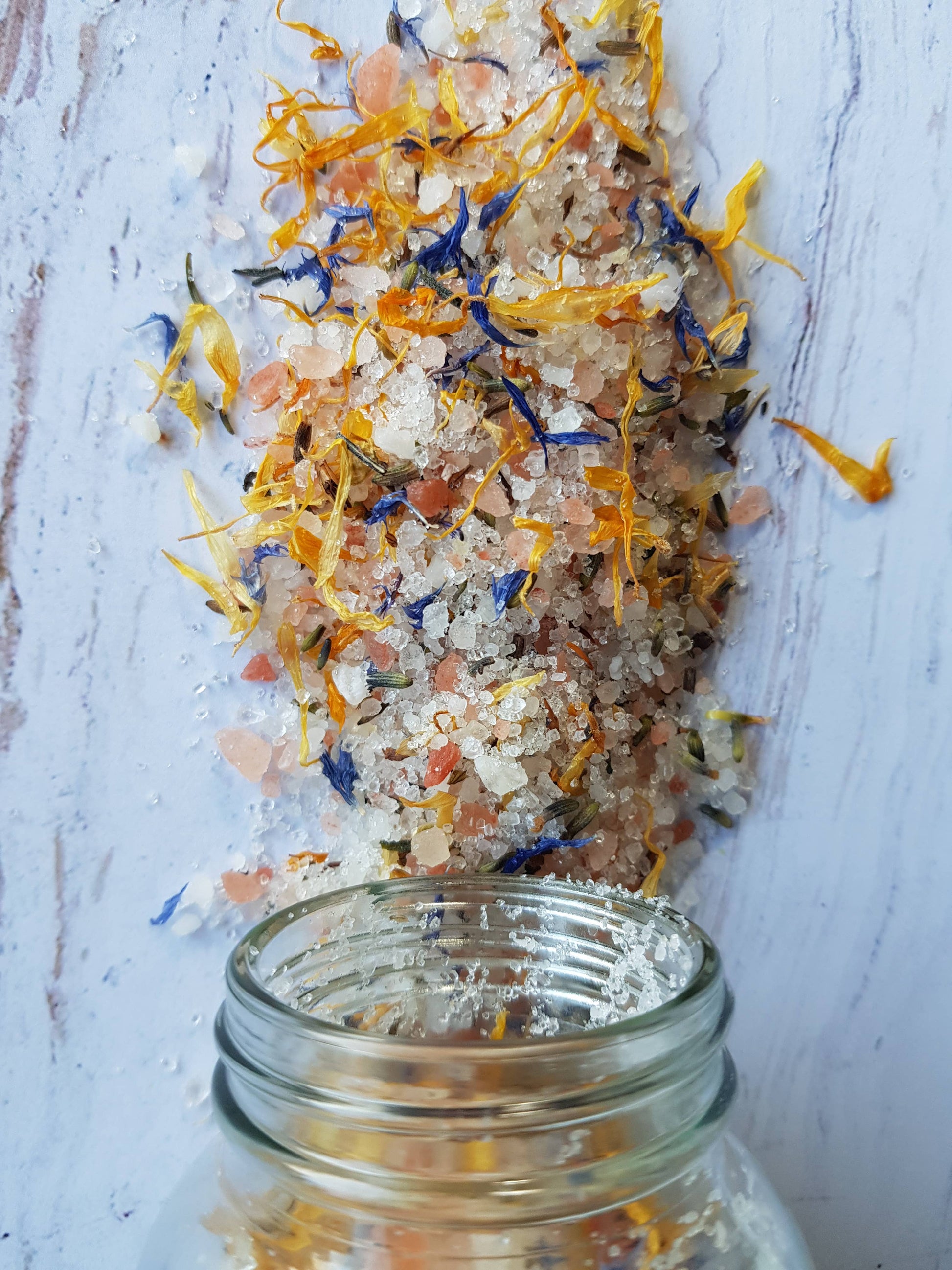 Sodium Chloride (Salt), Magnesium Sulfate (Epsom Salt), Lavandula angustifolia (Lavender) Oil, Rosemarinus officianalis (Rosemary) Oil, Cupressus sempervirens (Cypress) Oil, Calendula officinialis petals, Lavandula Angustifolia (Lavender) Buds, Centaurea cyanus (Cornflowers) (Limonene, Linalool)