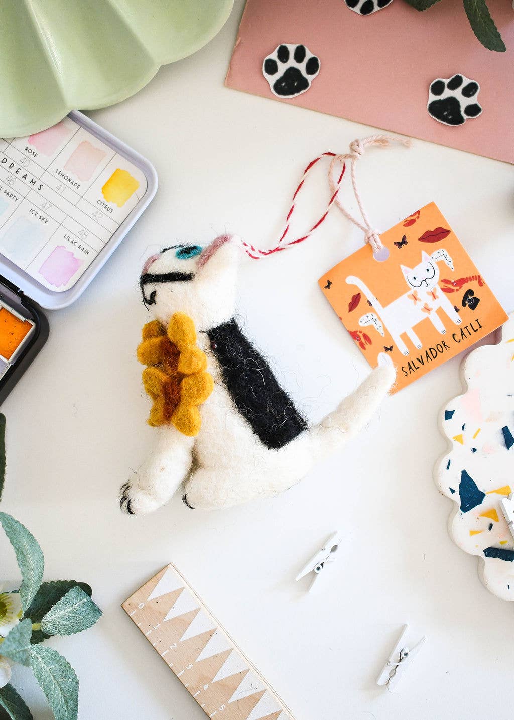 FELINE FELT, FUR FRIENDS Introducing 'Salvador Catli' inspired by art legend Salvador Dali. These feline felt tree decorations make the ideal gift or PURR-fect for hanging on the Christmas Tree. - Original design by Nia Gould - Felted wool decoration - 100% fair trade - Handcrafted in Nepal - Due to the hand crafted nature and naturally dyed felt wool the products may vary slightly from the image shown. -