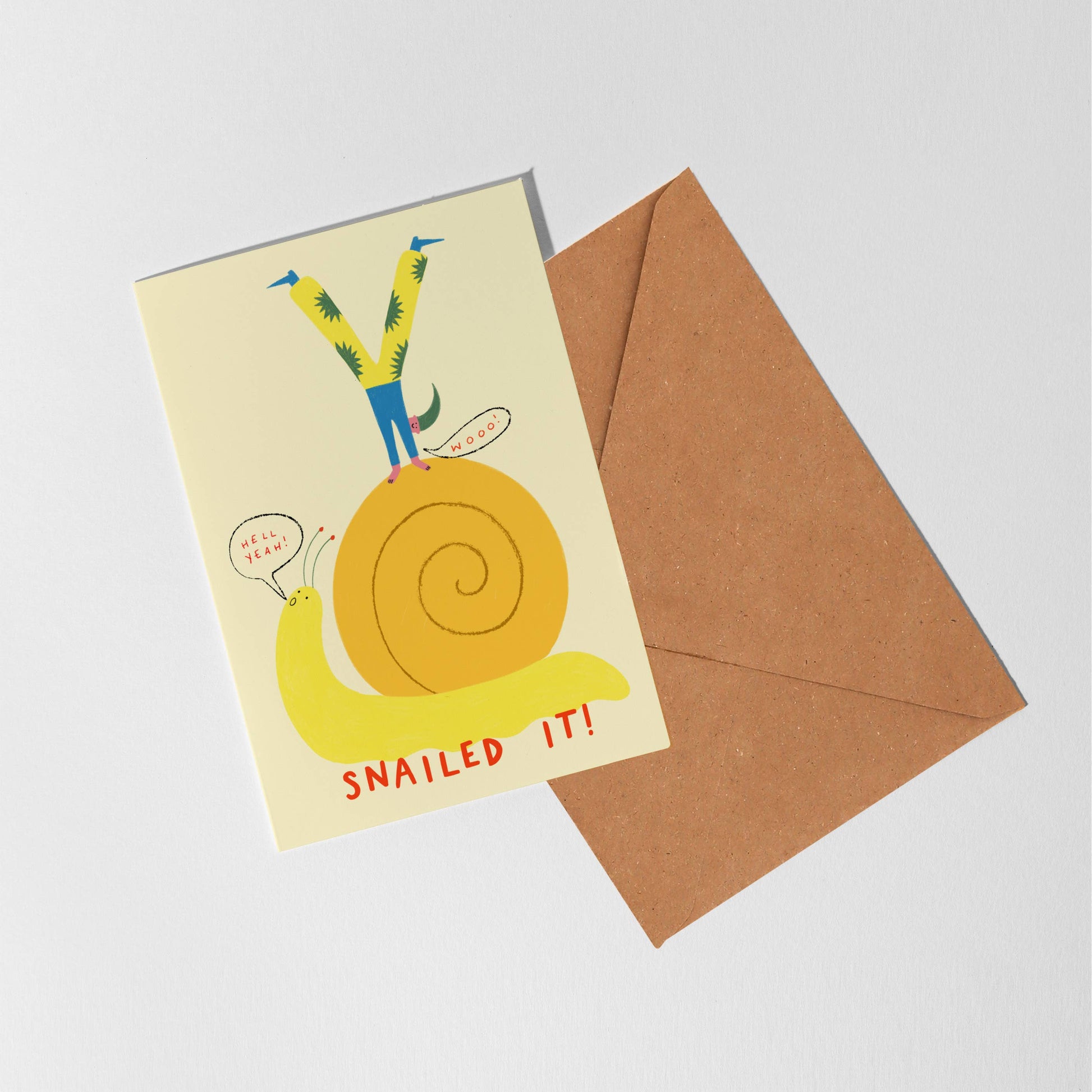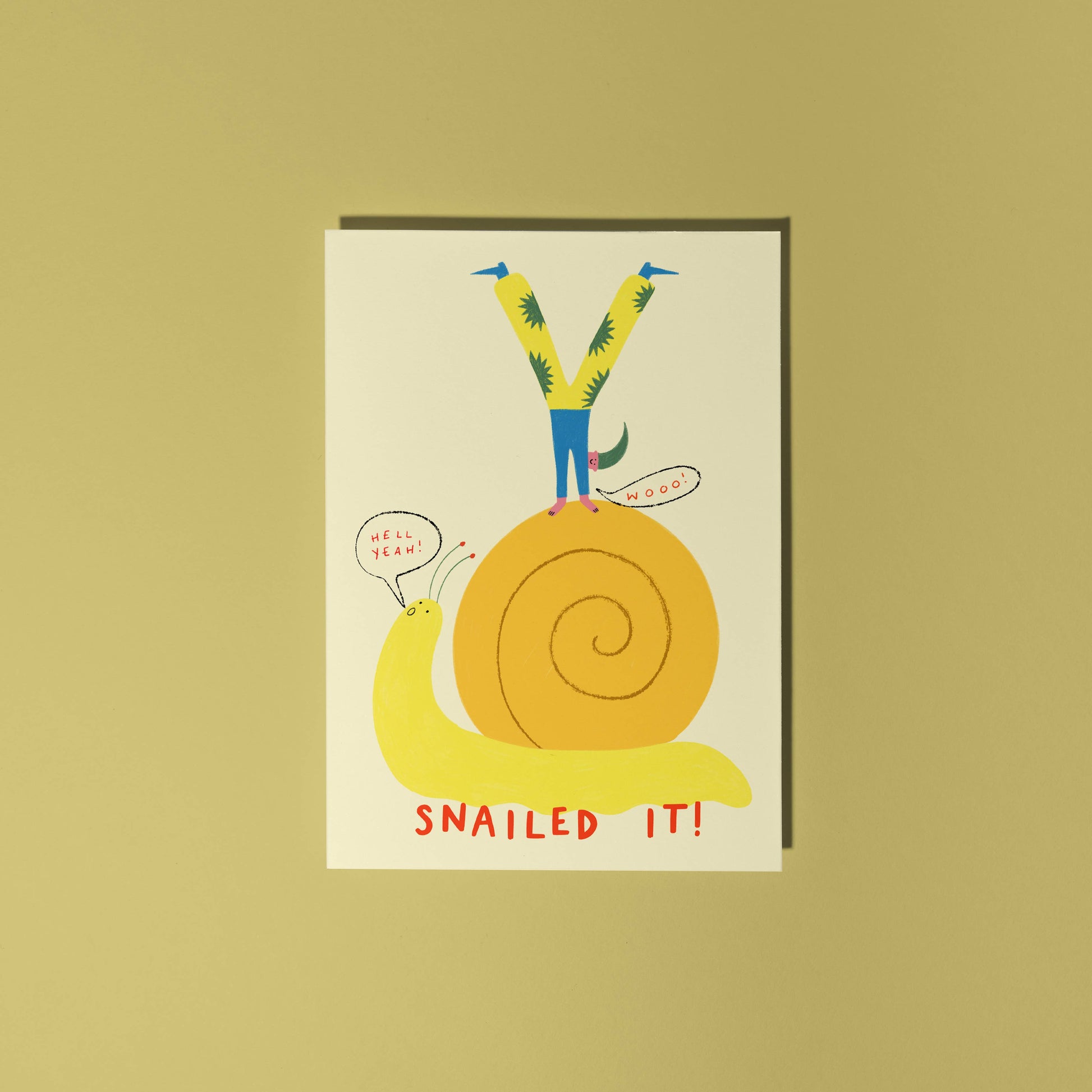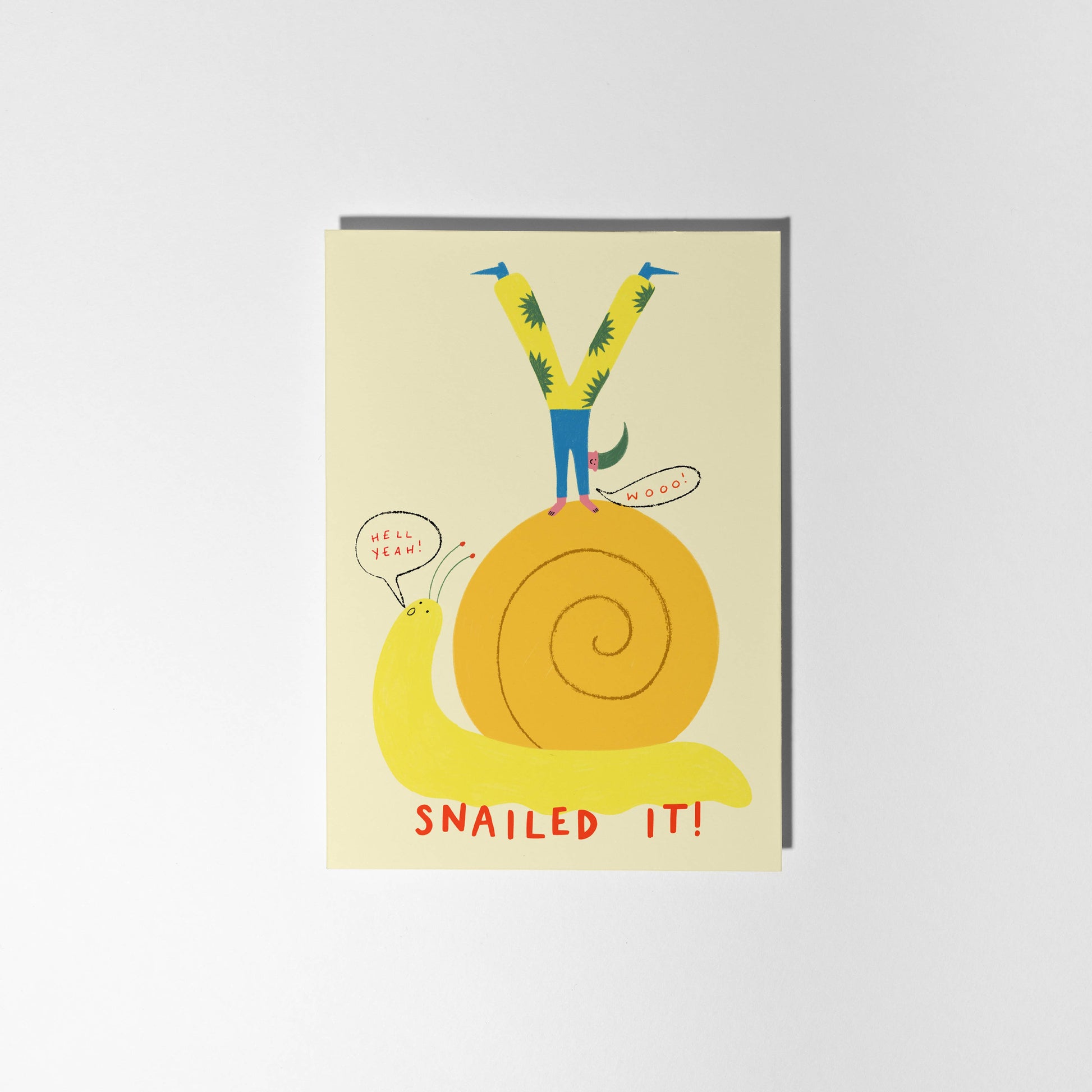 Illustrated card featuring a person on top of a snail celebrating a life achievement. Text reads 'Snailed It!'. Perfect for passing exams, graduation, passing driving tests and other big life achievements.