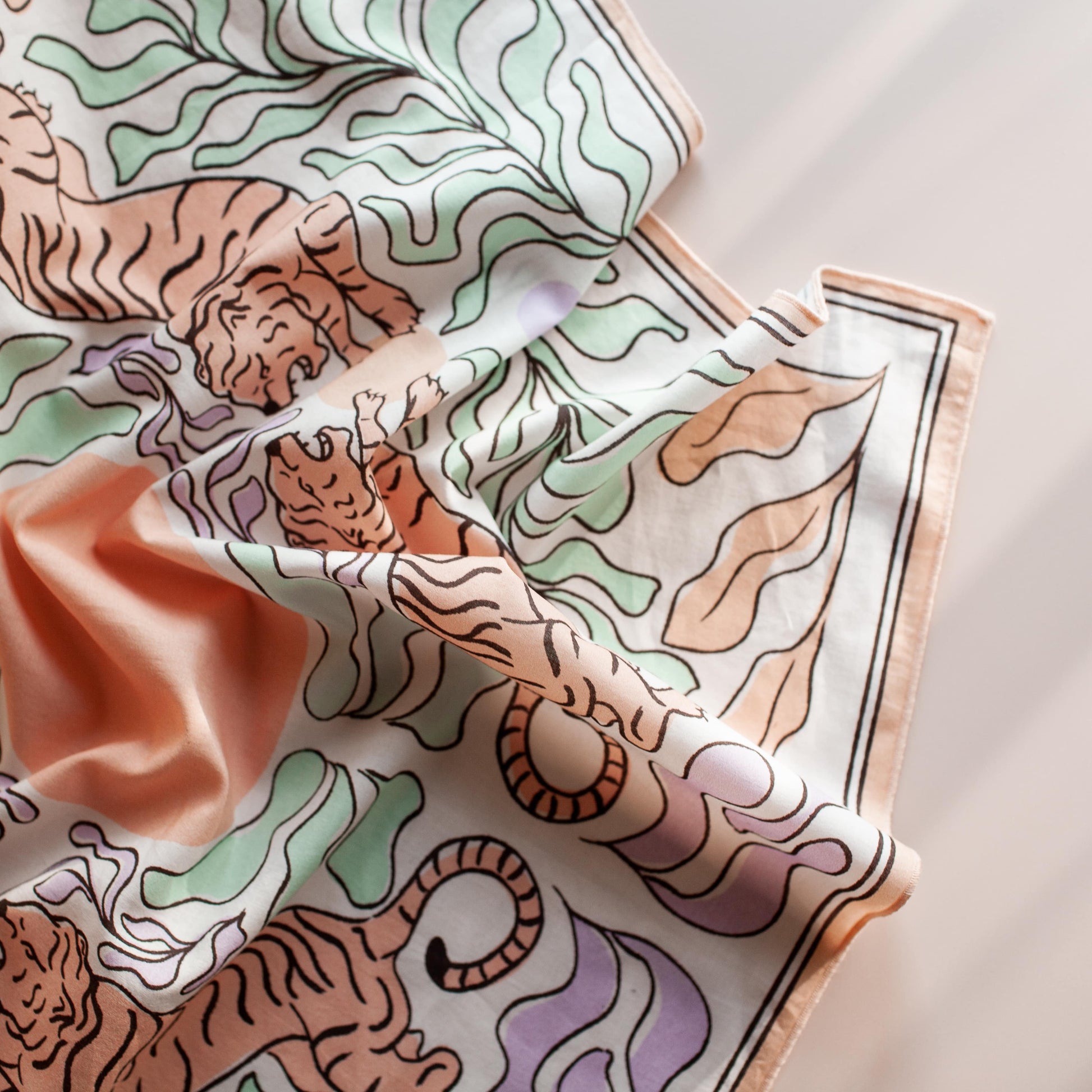 Accessorize your style with this bold, colourful, printed bandana featured in a classic colourful cai & jo design. Use as a face covering, tie into your hair, use as a neck scarf or anything else you can think of!