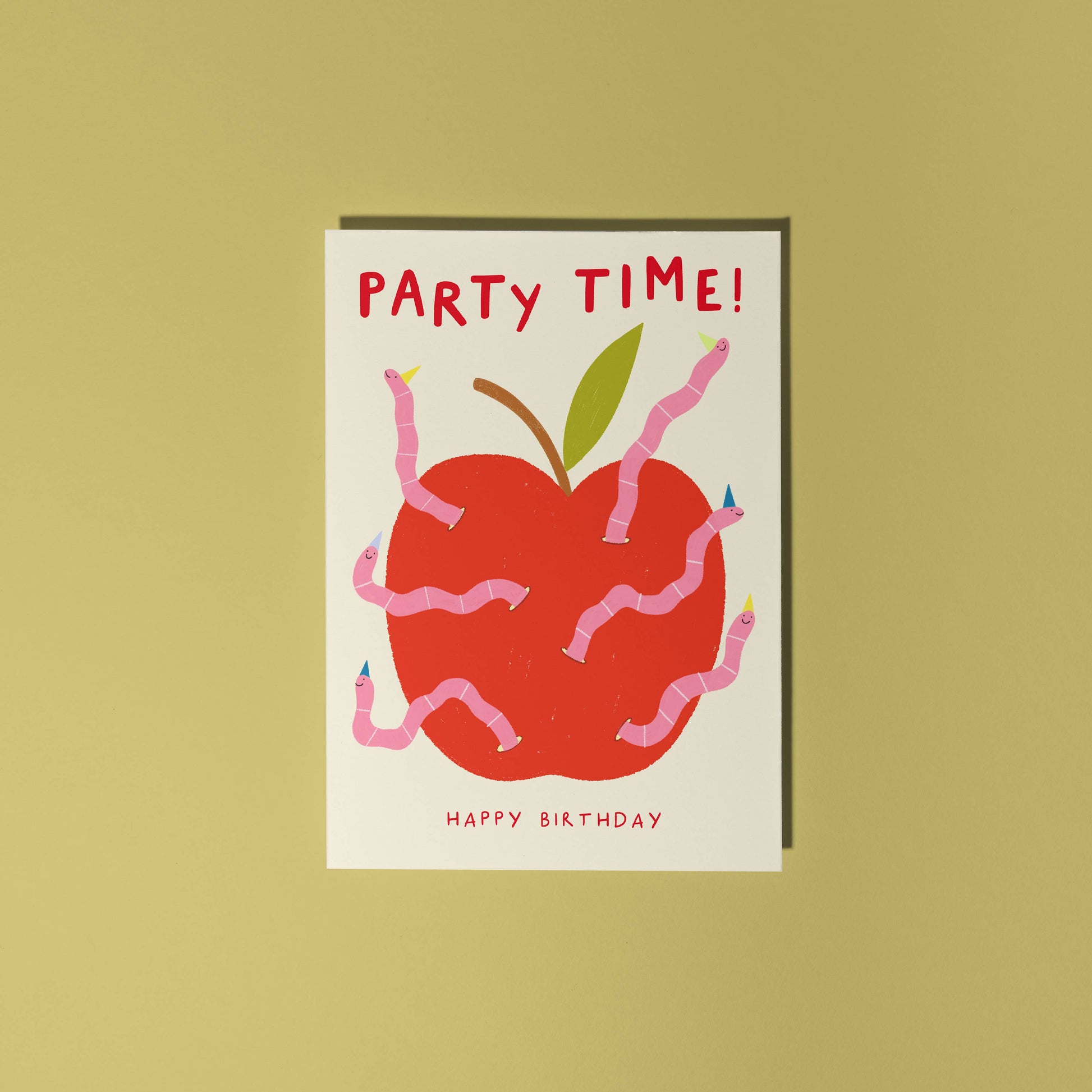 Fun birthday card featuring illustrations of worms in an apple wearing party hats. Text reads 'Party Time! Happy Birthday'. This card is perfect for all genders, ages and personalities.